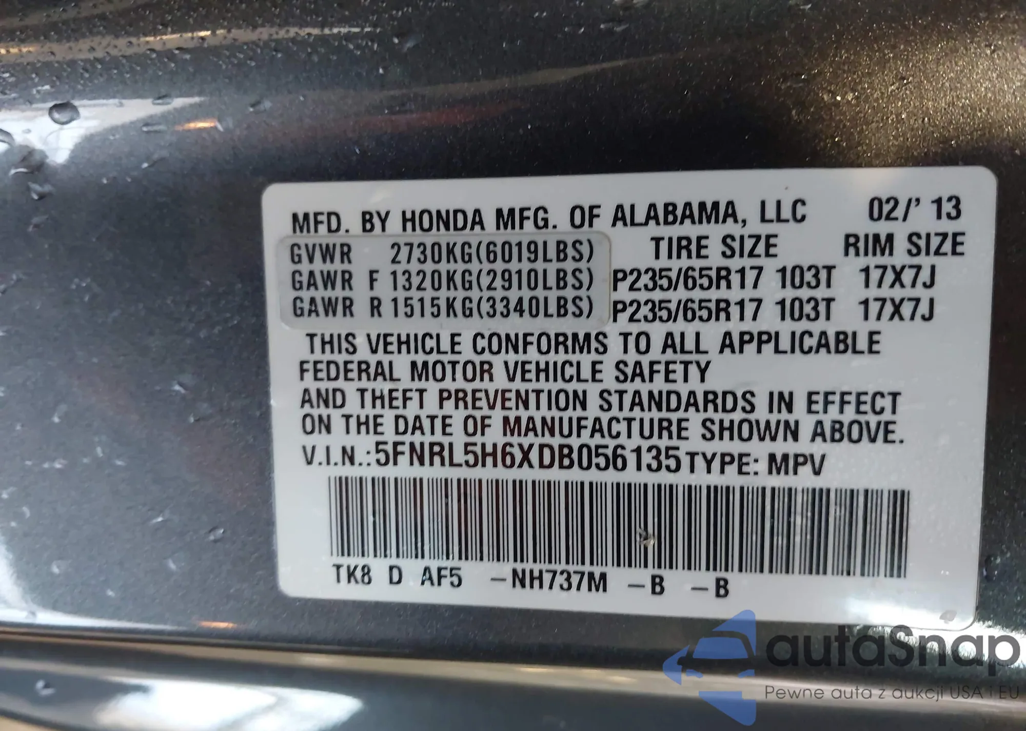 Автомобиль Honda Odyssey 2013 (VIN 5FNRL5H6XDB056135) ранее не участвовал в торгах. Документы чистые, пробег соответствует или ниже среднего по рынку. Продаётся страховой компанией — рекомендуем покупку. Доставка в порт займет около 6–8 недель.