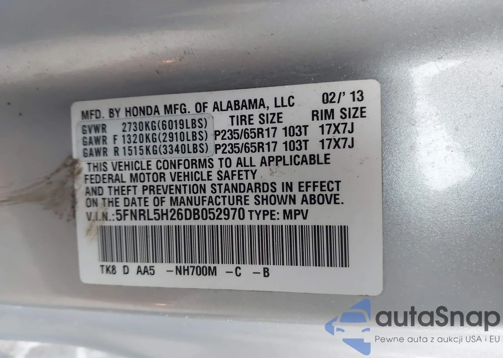 VIN: 5FNRL5H26DB052970
