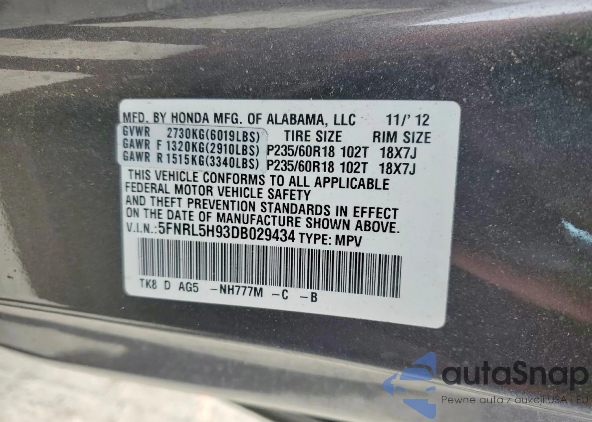 VIN: 5FNRL5H93DB029434