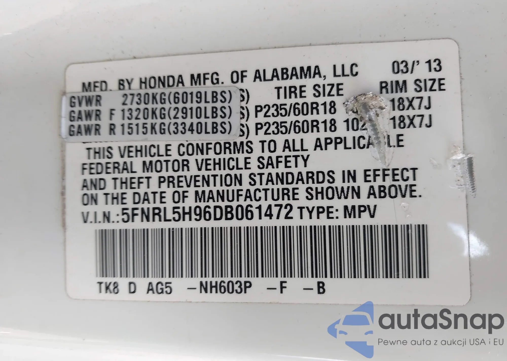 VIN: 5FNRL5H96DB061472