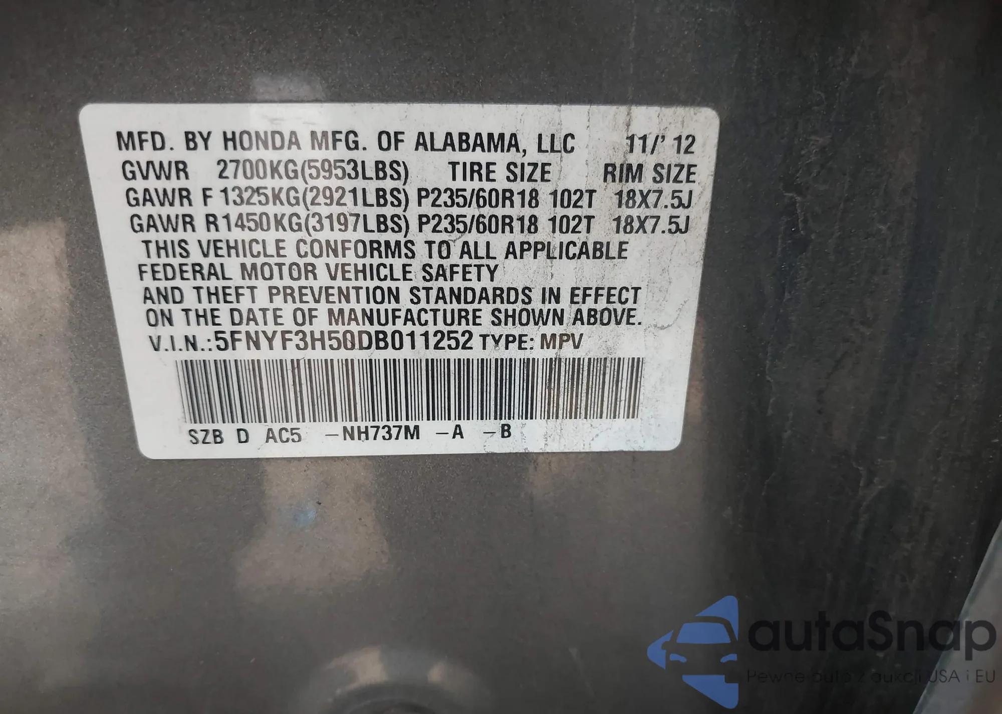 Автомобиль Honda Pilot 2013 (VIN 5FNYF3H50DB011252) ранее не участвовал в торгах. Документы чистые, пробег соответствует или ниже среднего по рынку. Продаётся страховой компанией — рекомендуем покупку. Доставка в порт займет около 6–8 недель.