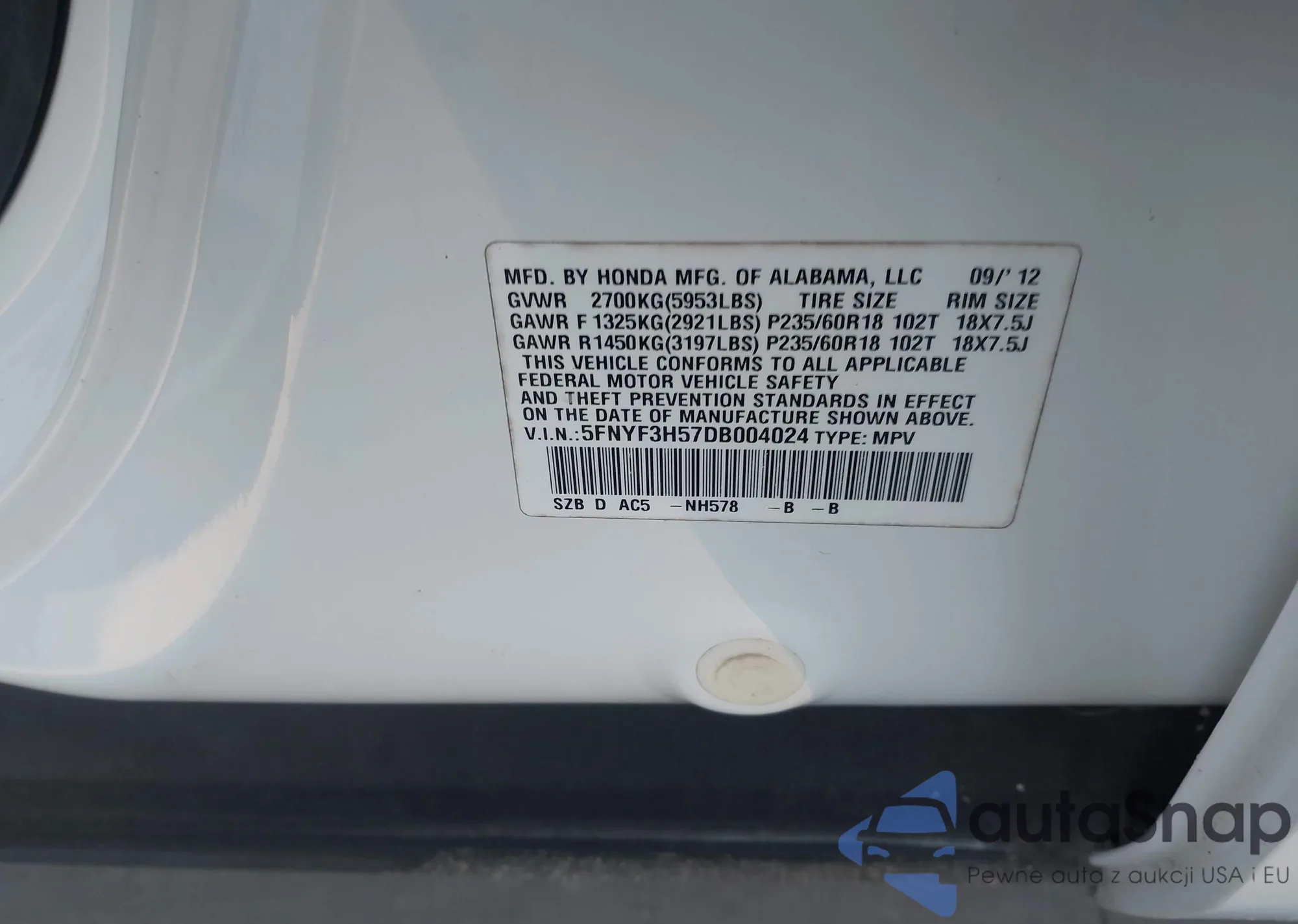 VIN: 5FNYF3H57DB004024