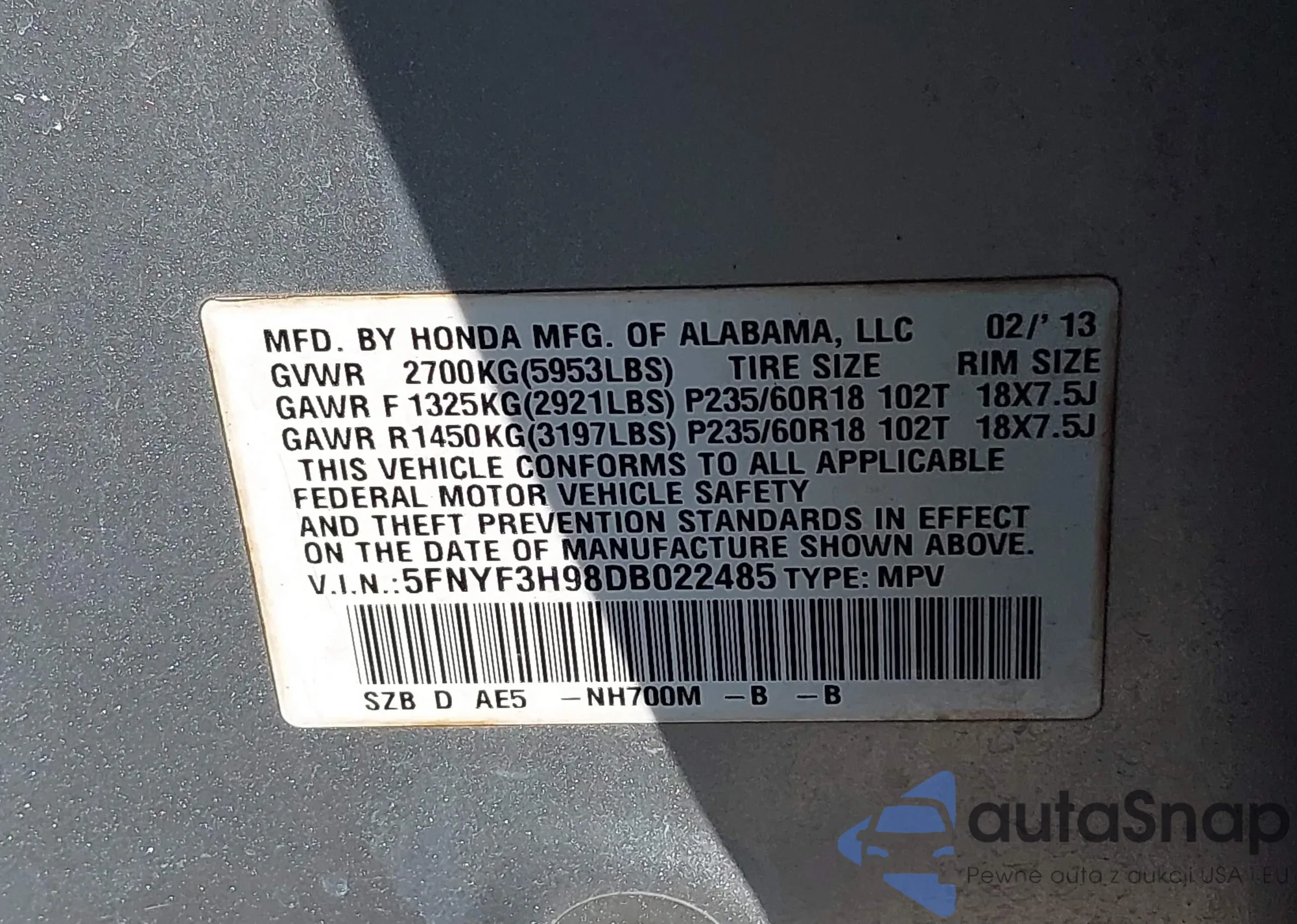 VIN: 5FNYF3H98DB022485