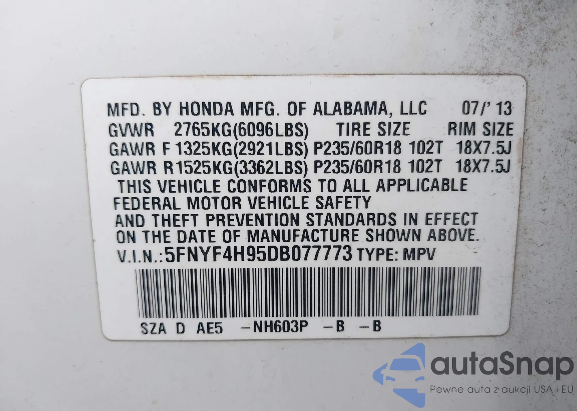 VIN: 5FNYF4H95DB077773