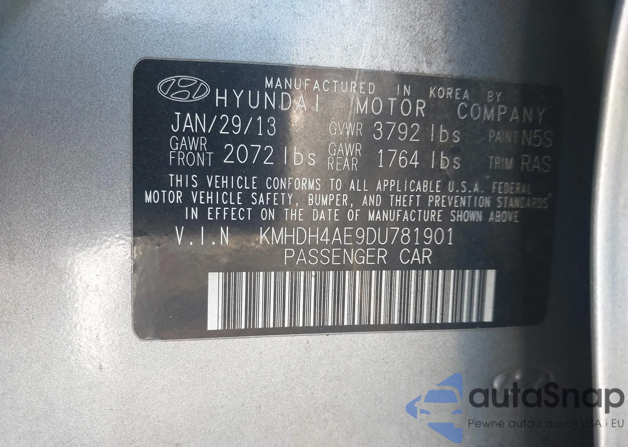 Автомобиль Hyundai Elantra 2013 (VIN KMHDH4AE9DU781901) ранее не участвовал в торгах. Документы чистые, пробег соответствует или ниже среднего по рынку. Продаётся страховой компанией — рекомендуем покупку. Доставка в порт займет около 6–8 недель.