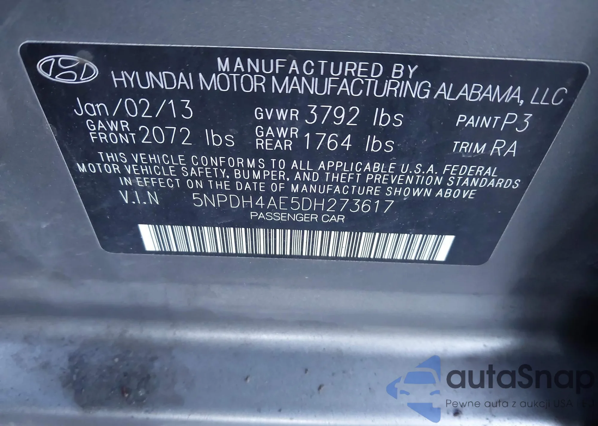 VIN: 5NPDH4AE5DH273617