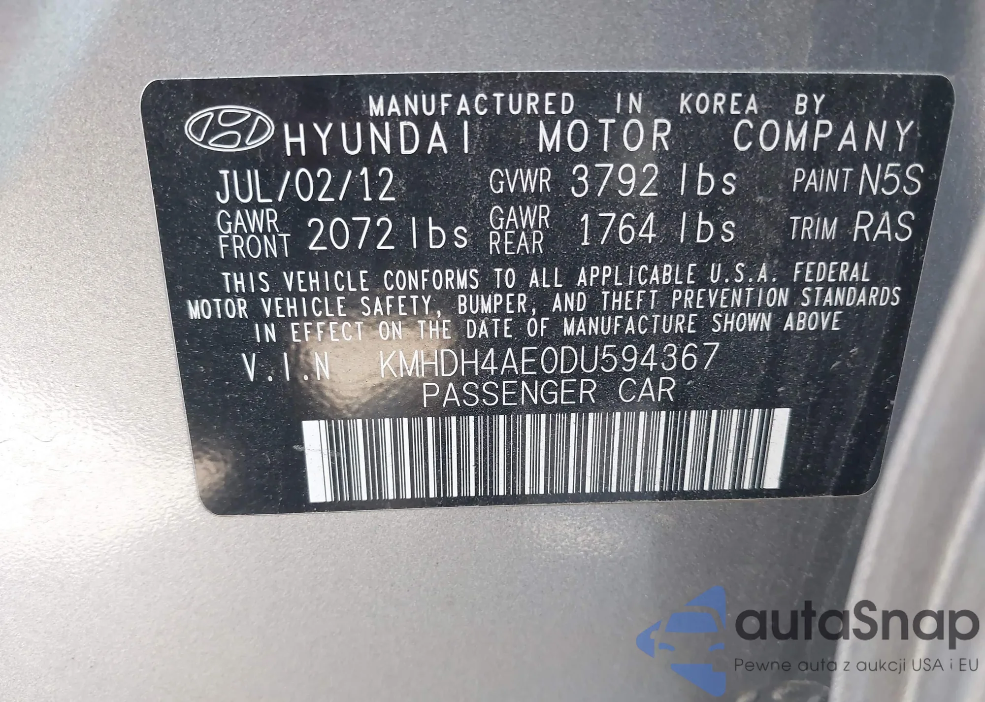 Автомобиль Hyundai Elantra 2013 (VIN KMHDH4AE0DU594367) ранее не участвовал в торгах. Документы чистые, пробег соответствует или ниже среднего по рынку. Продаётся страховой компанией — рекомендуем покупку. Доставка в порт займет около 6–8 недель.
