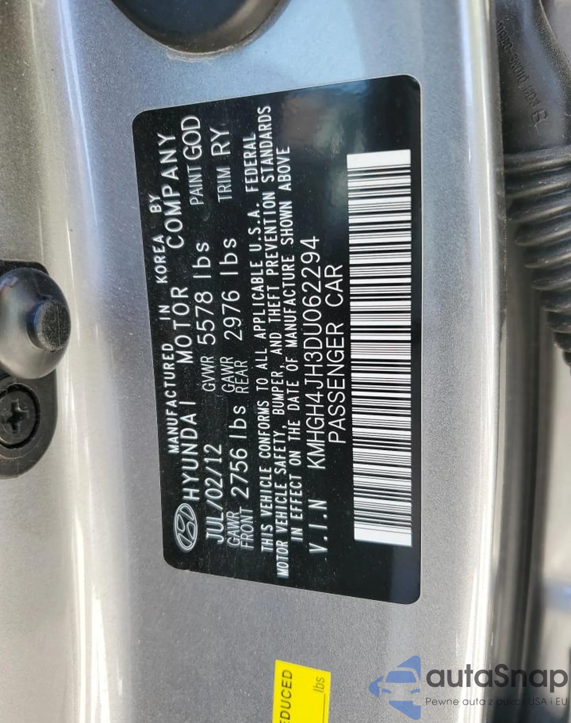 VIN: KMHGH4JH3DU062294