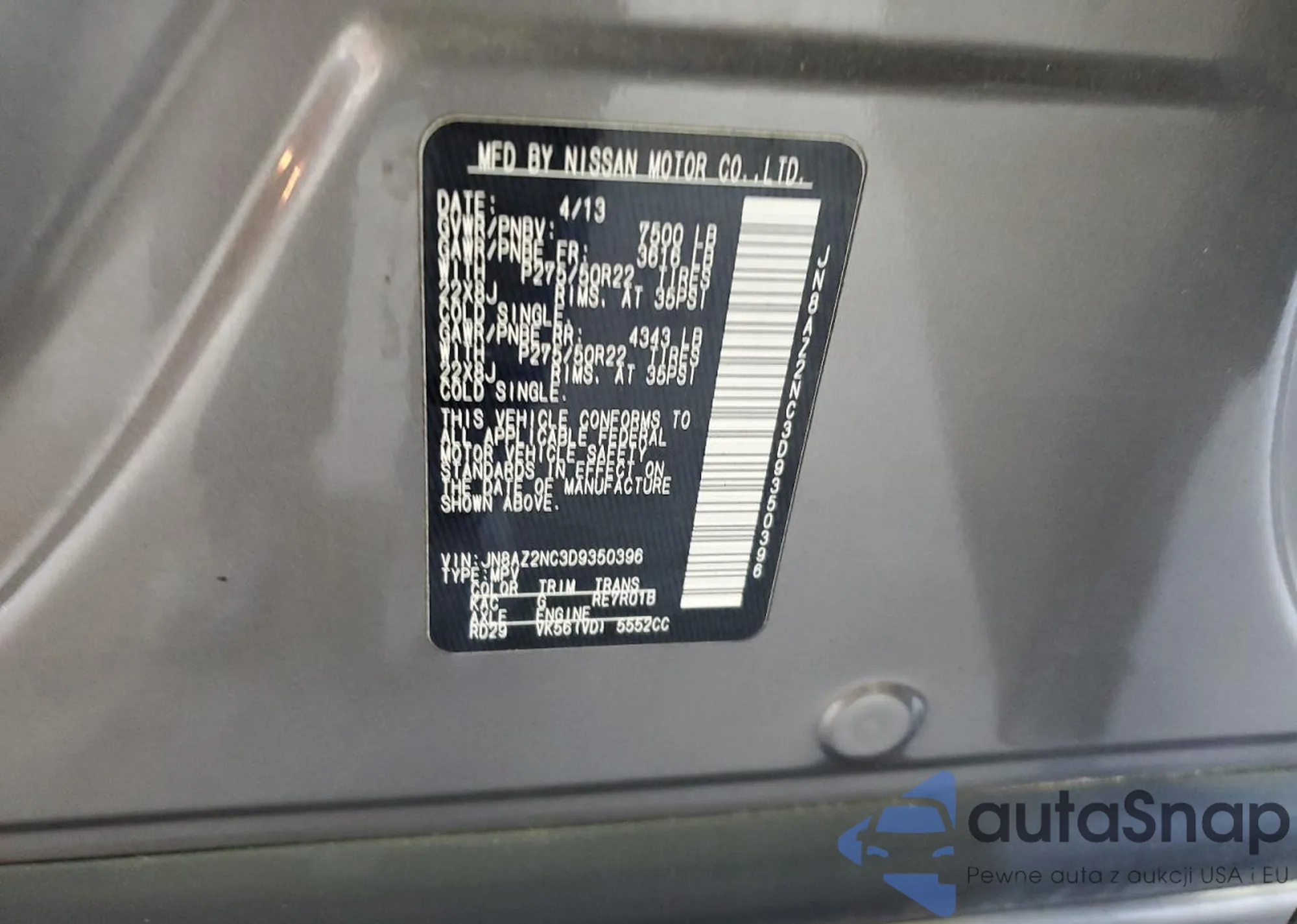 Автомобиль Infiniti QX56 2013 (VIN JN8AZ2NC3D9350396) имеет документы, препятствующие регистрации. Могут возникнуть сложности при экспорте и регистрации. Обратитесь к экспертам AutaSnap для поиска альтернатив.