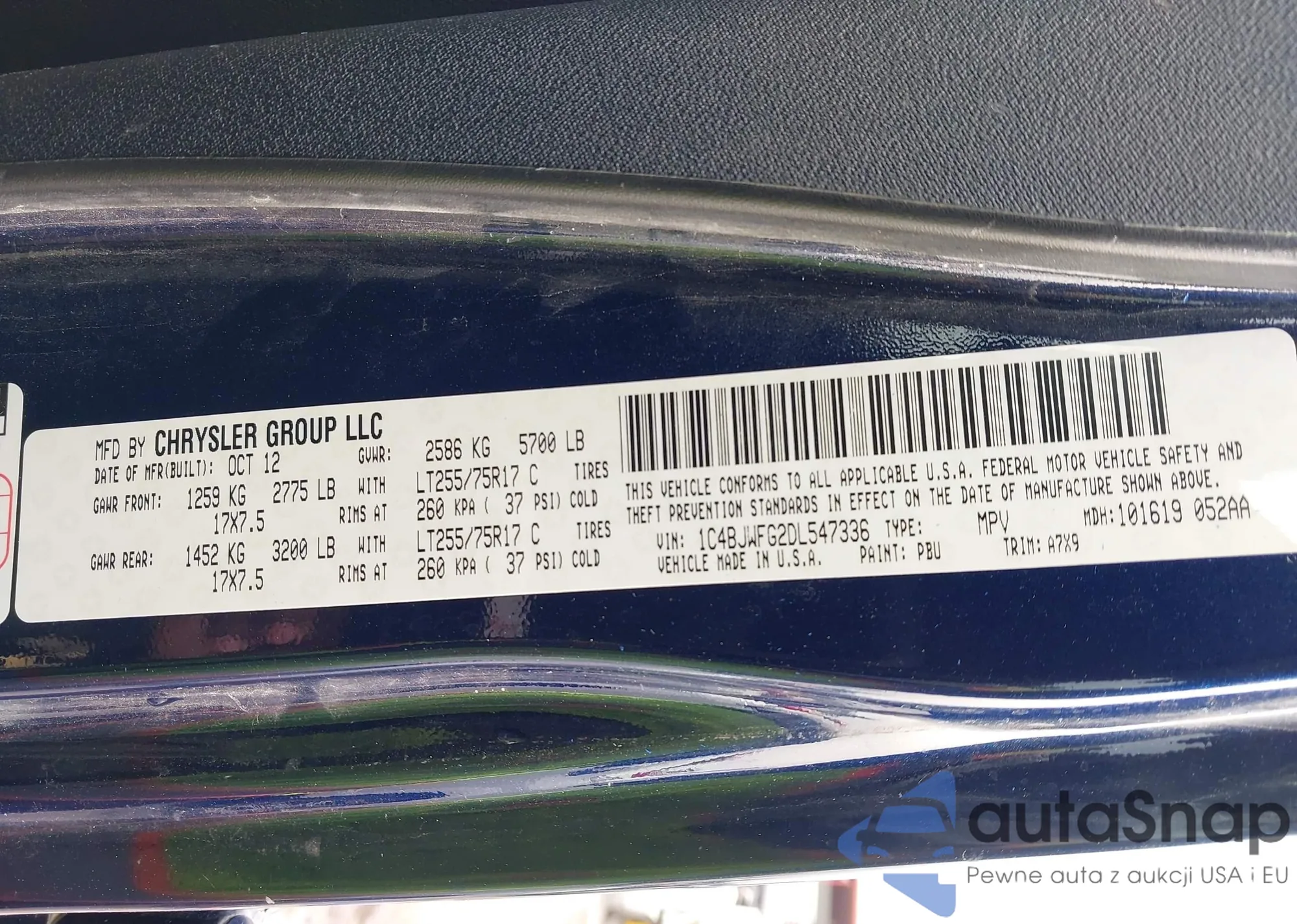 Автомобиль Jeep Wrangler 2013 (VIN 1C4BJWFG2DL547336) ранее не участвовал в торгах. Документы чистые, пробег соответствует или ниже среднего по рынку. Продаётся страховой компанией — рекомендуем покупку. Доставка в порт займет около 6–8 недель.