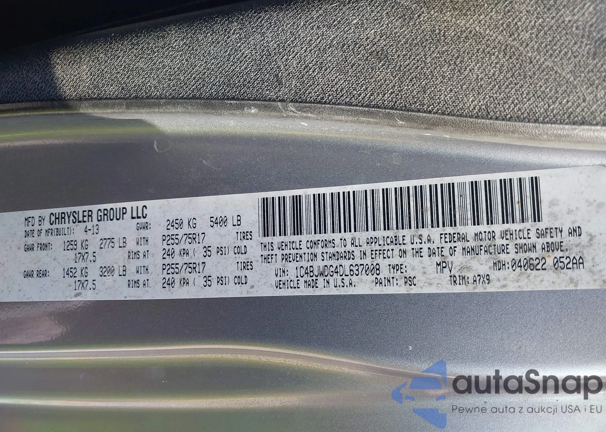 Автомобиль Jeep Wrangler 2013 (VIN 1C4BJWDG4DL637008) имеет документы, препятствующие регистрации. Могут возникнуть сложности при экспорте и регистрации. Обратитесь к экспертам AutaSnap для поиска альтернатив.