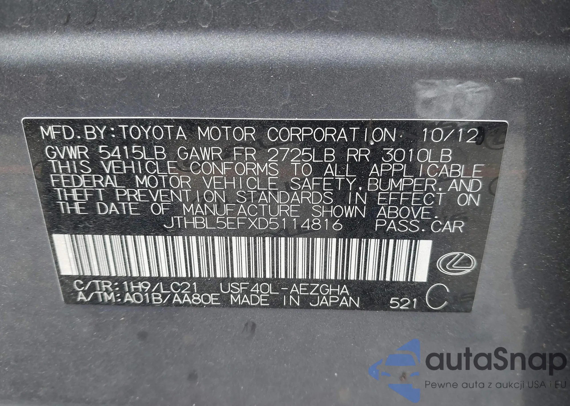 Автомобиль Lexus LS 2013 (VIN JTHBL5EFXD5114816) ранее не участвовал в торгах. Документы чистые, пробег соответствует или ниже среднего по рынку. Продаётся страховой компанией — рекомендуем покупку. Доставка в порт займет около 6–8 недель.