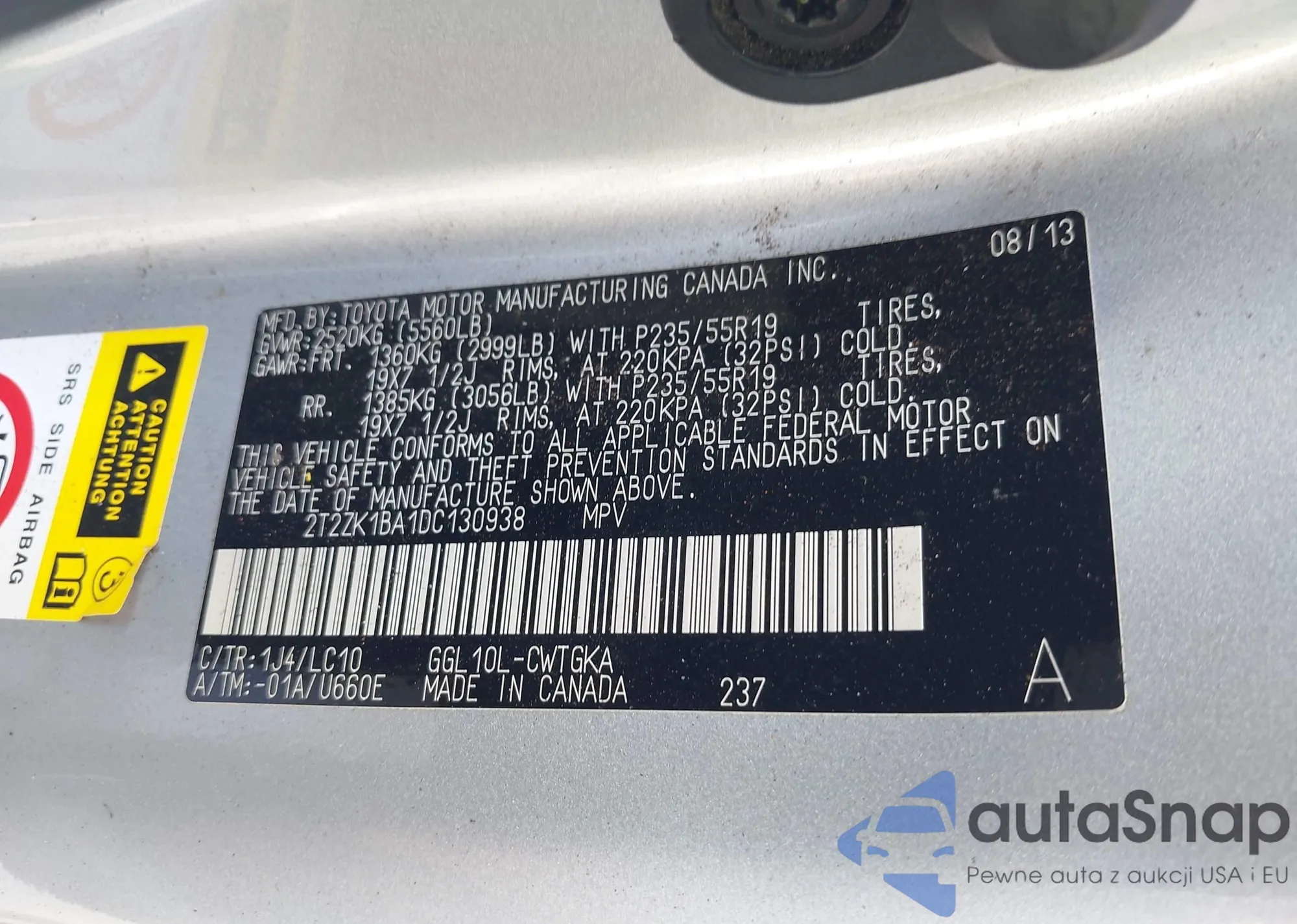 VIN: 2T2ZK1BA1DC130938