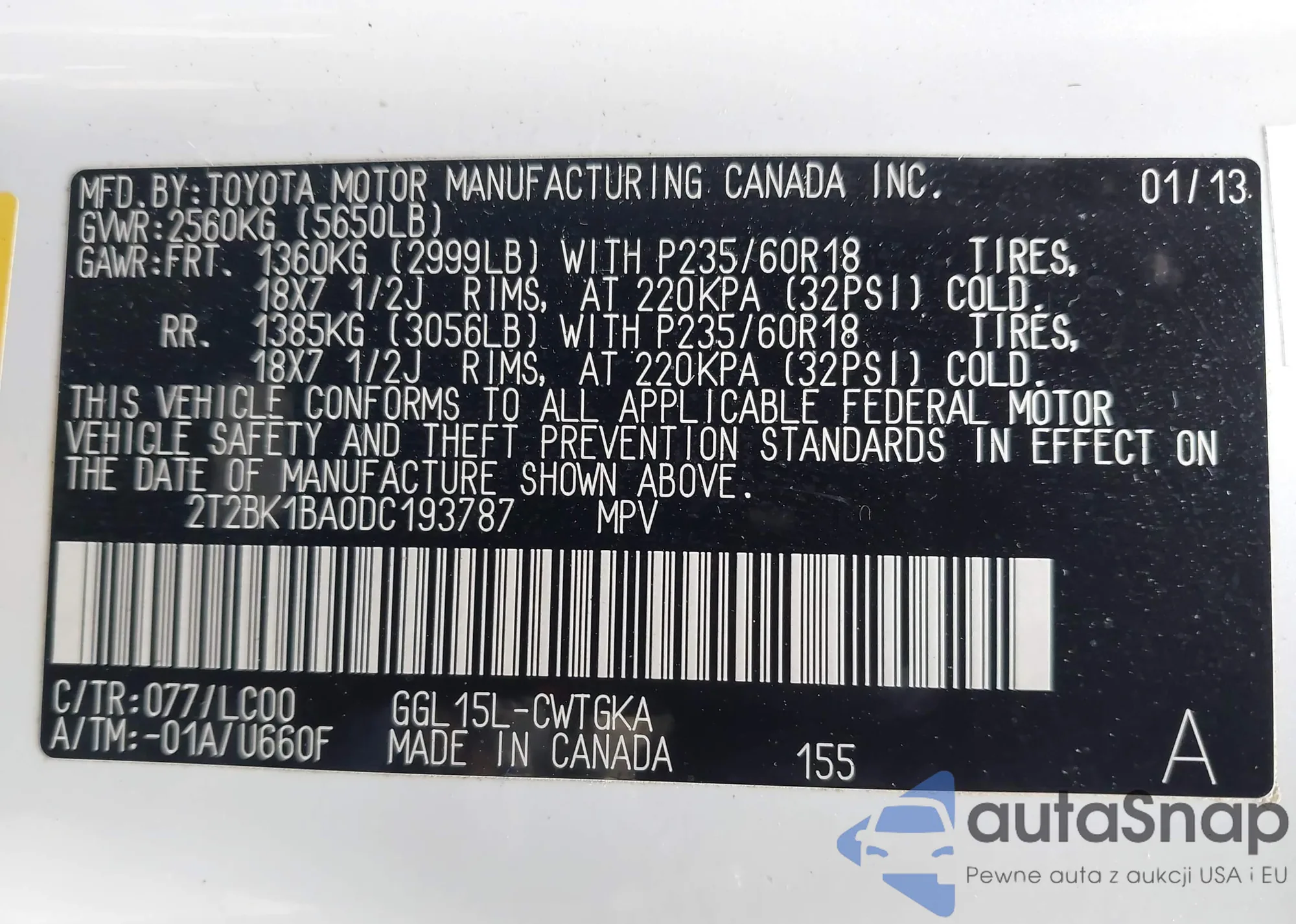 VIN: 2T2BK1BA0DC193787