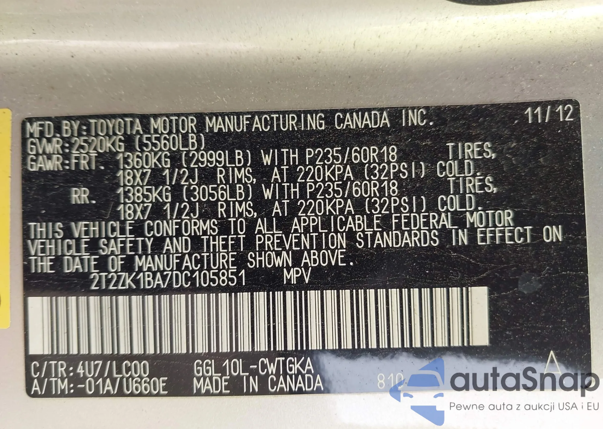 VIN: 2T2ZK1BA7DC105851