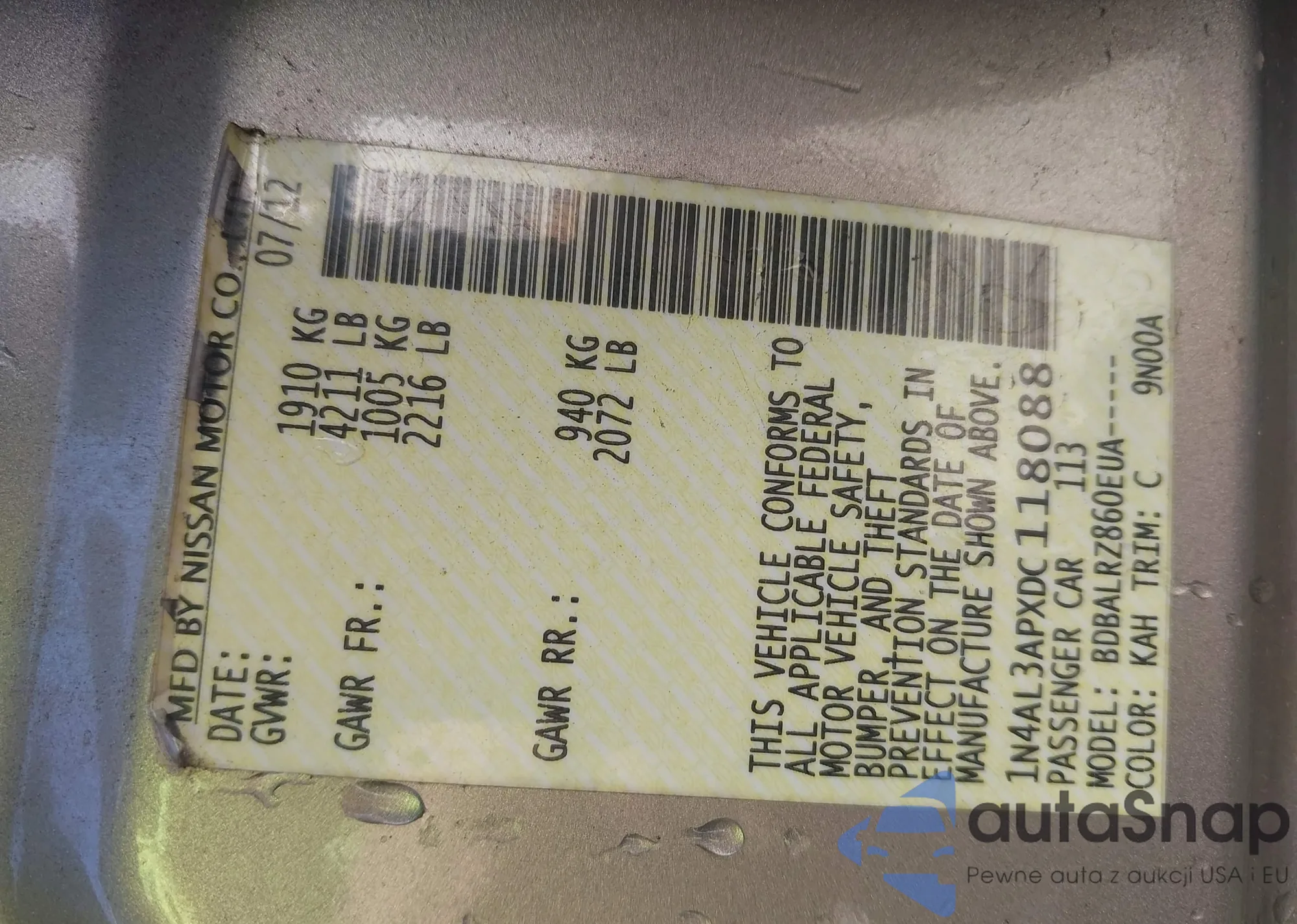 • VIN: 1N4AL3APXDC118088