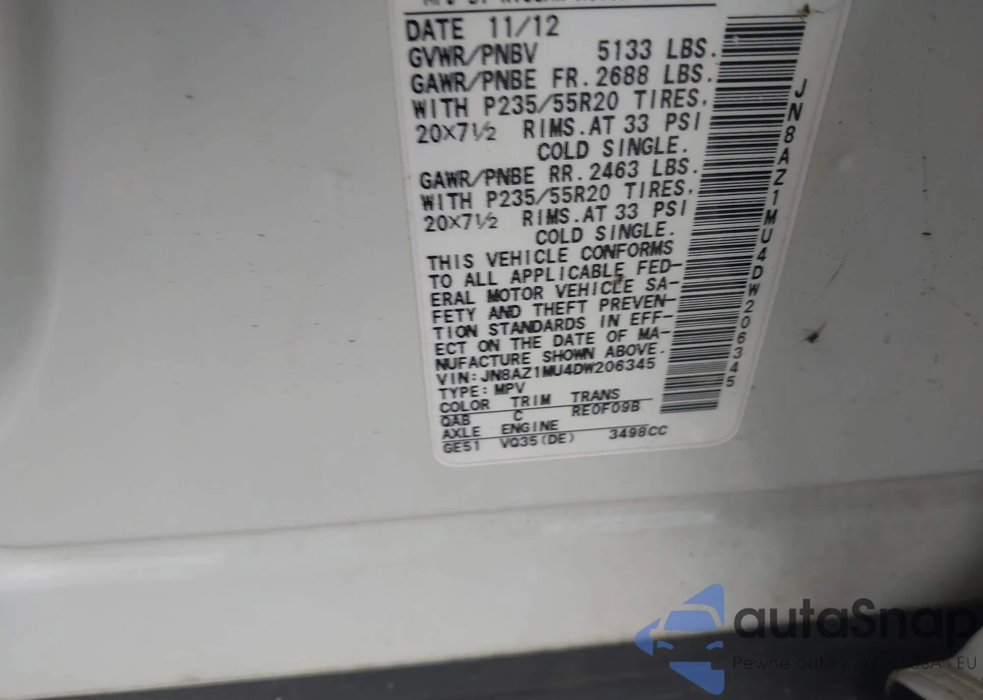 VIN: JN8AZ1MU4DW206345