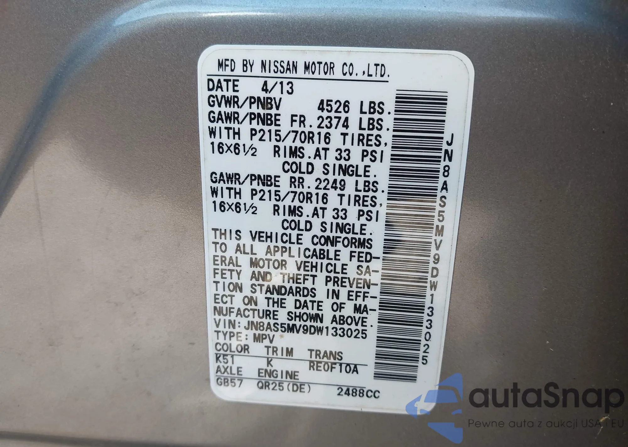 VIN: JN8AS5MV9DW133025