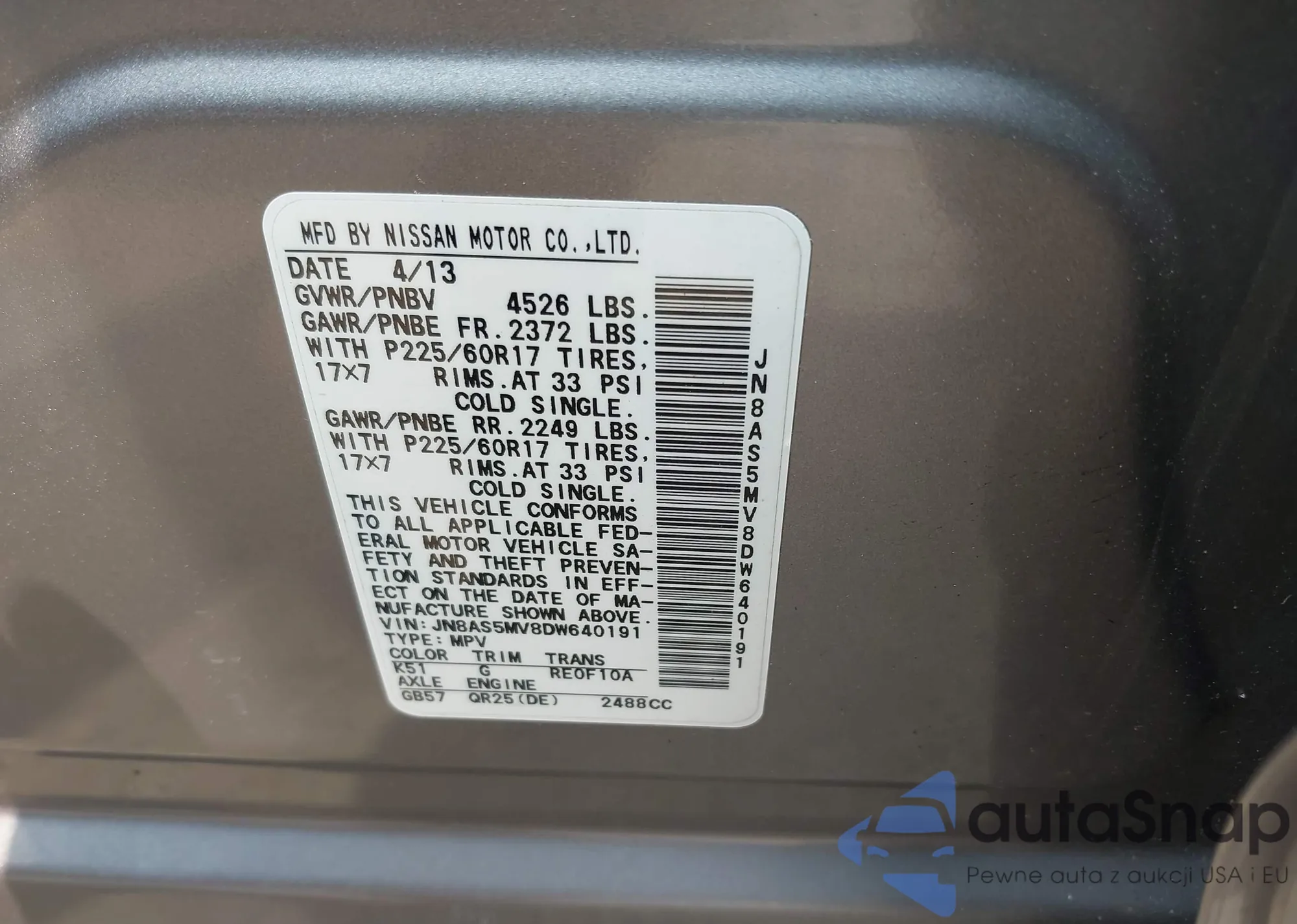 VIN: JN8AS5MV8DW640191