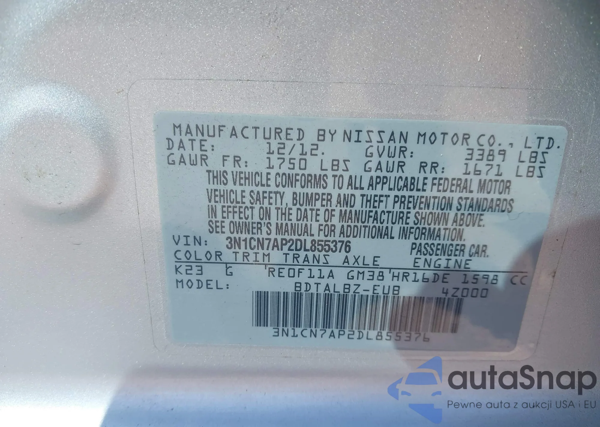 VIN: 3N1CN7AP2DL855376