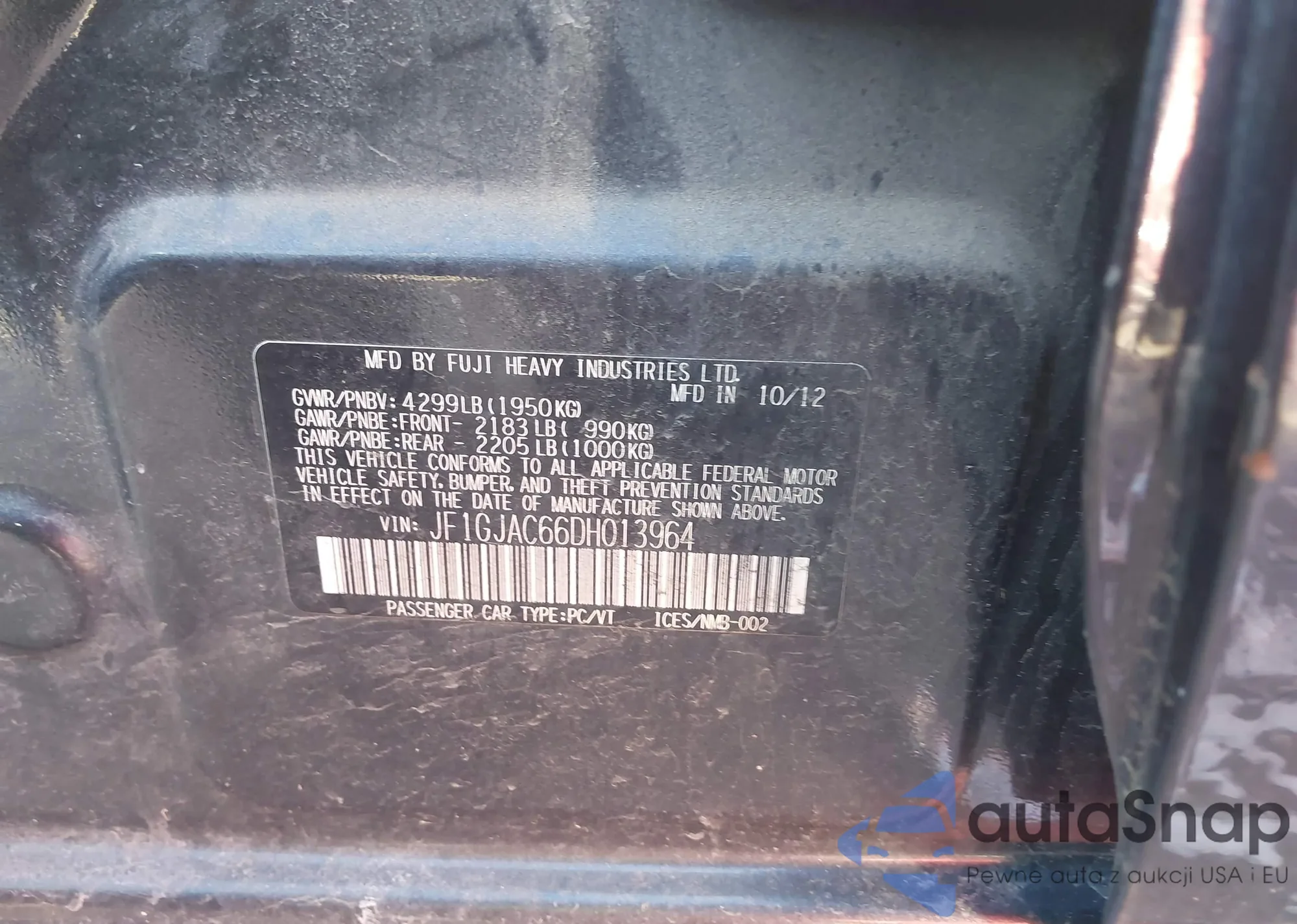 Автомобиль Subaru Impreza 2013 (VIN JF1GJAC66DH013964) ранее не участвовал в торгах. Документы чистые, пробег соответствует или ниже среднего по рынку. Продаётся страховой компанией — рекомендуем покупку. Доставка в порт займет около 6–8 недель.