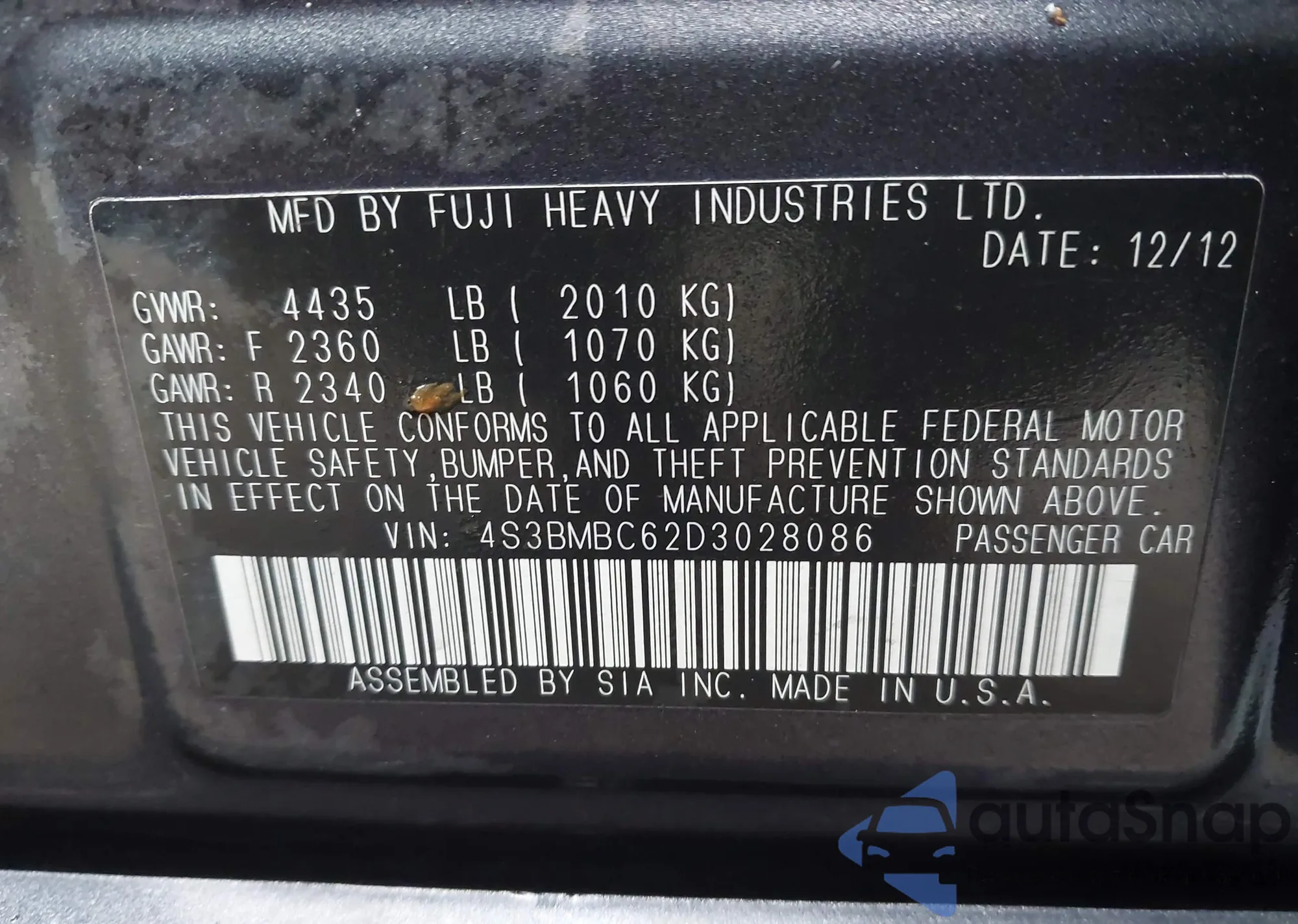 Автомобиль Subaru Legacy 2013 (VIN 4S3BMBC62D3028086) ранее не участвовал в торгах. Документы чистые, пробег соответствует или ниже среднего по рынку. Продаётся страховой компанией — рекомендуем покупку. Доставка в порт займет около 6–8 недель.