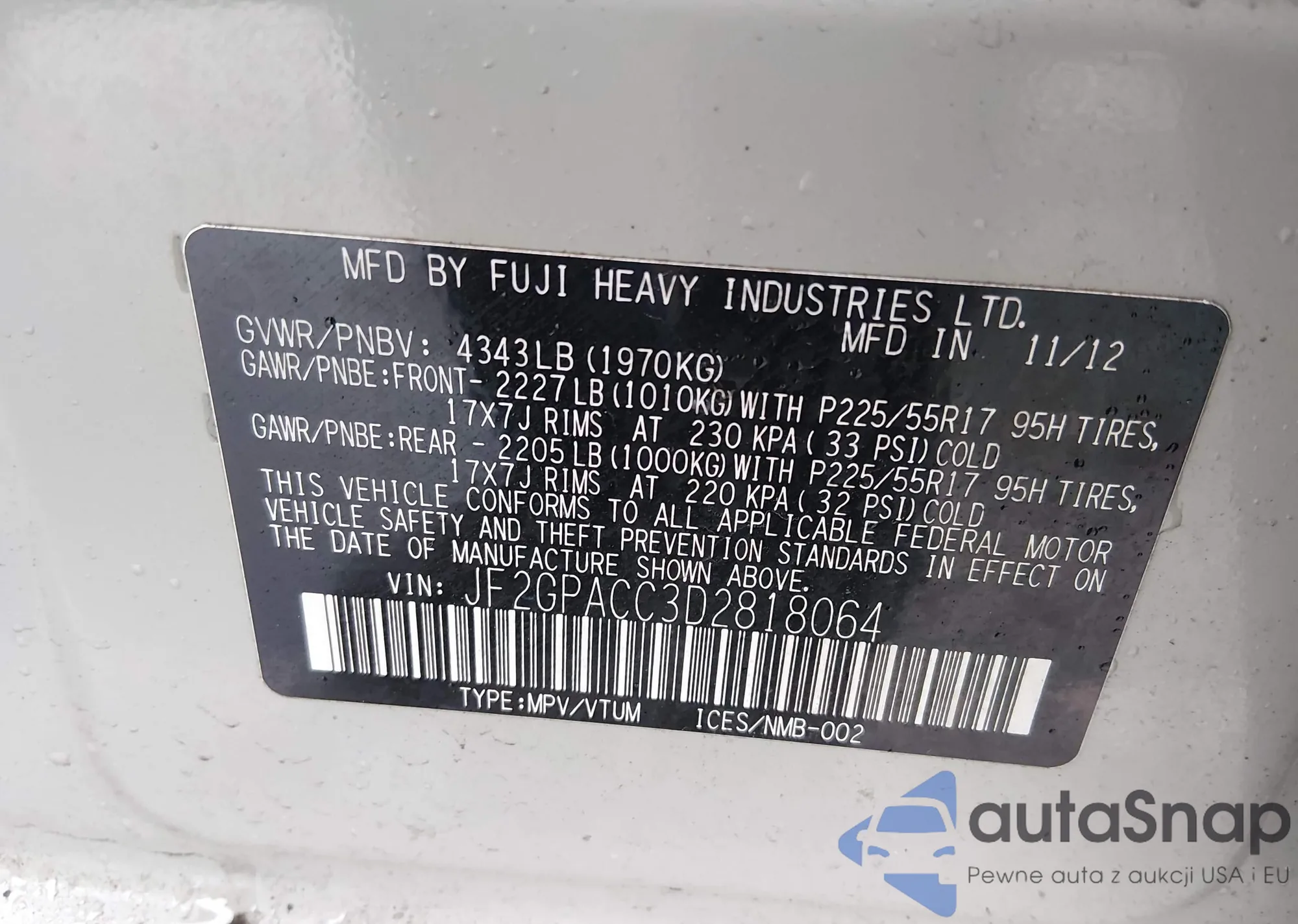 • VIN: JF2GPACC3D2818064