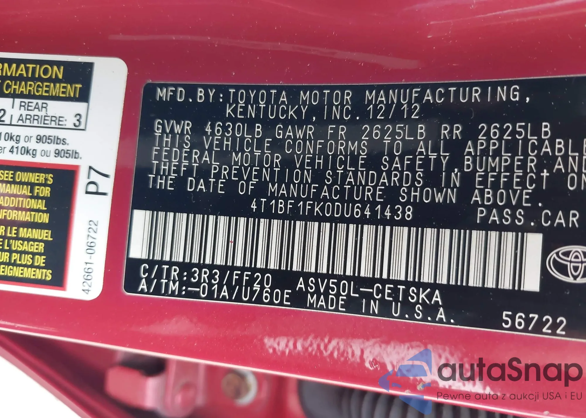 • VIN: 4T1BF1FK0DU641438