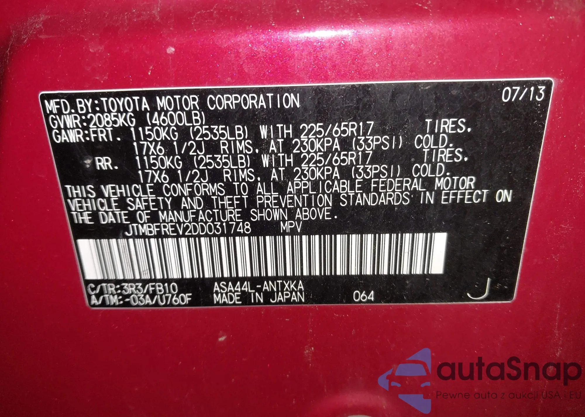 Автомобиль Toyota RAV 4 2013 (VIN JTMBFREV2DD031748) ранее не участвовал в торгах. Документы чистые, пробег соответствует или ниже среднего по рынку. Продаётся страховой компанией — рекомендуем покупку. Доставка в порт займет около 6–8 недель.