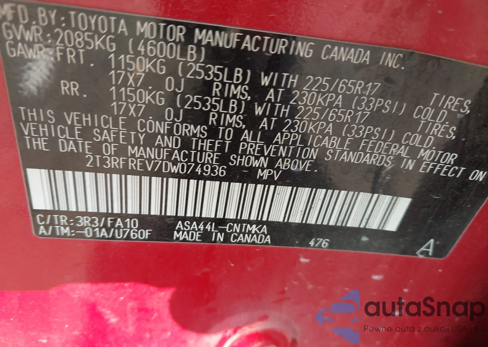 VIN: 2T3RFREV7DW074936
