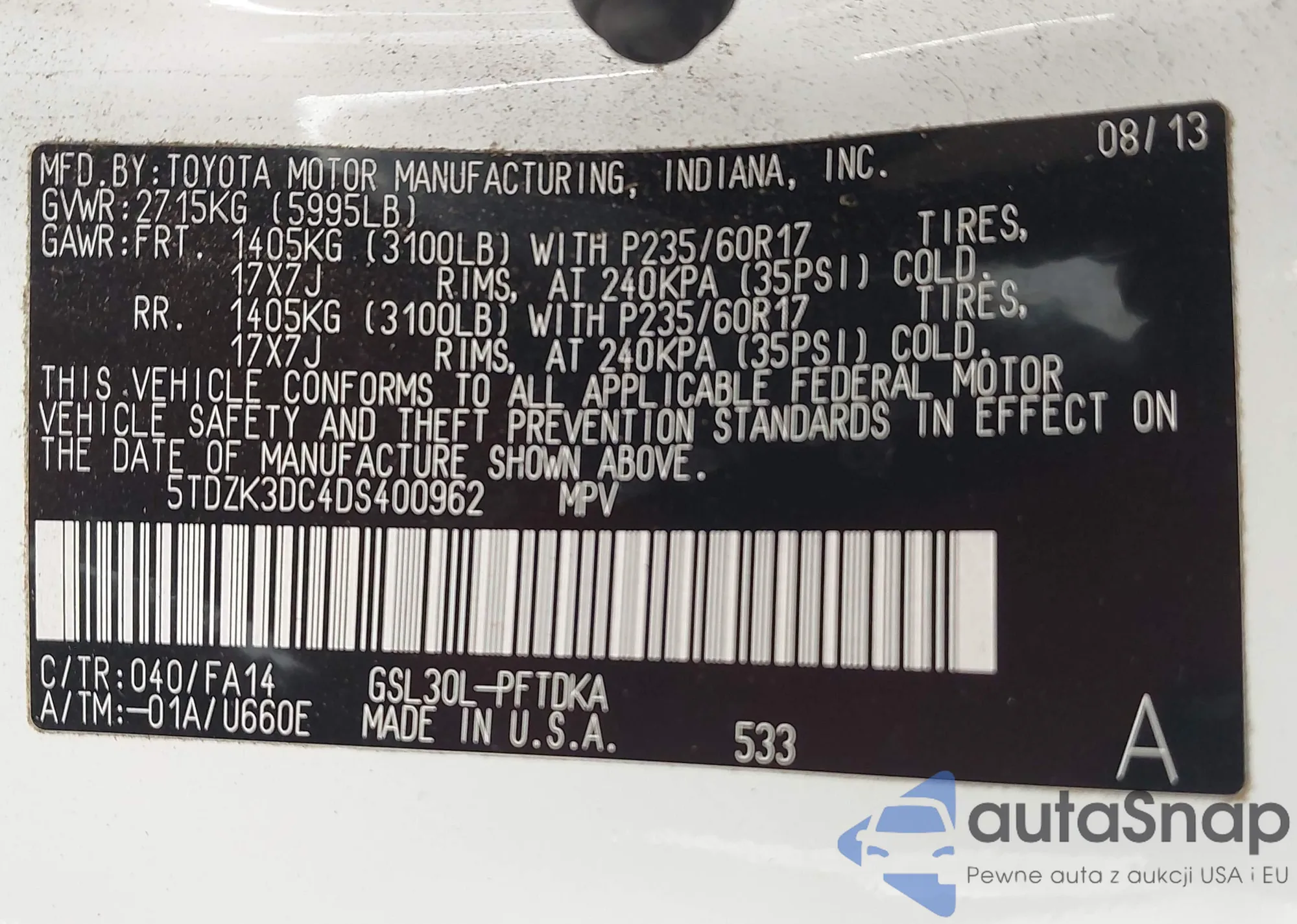 Автомобиль Toyota Sienna 2013 (VIN 5TDZK3DC4DS400962) ранее не участвовал в торгах. Документы чистые, пробег соответствует или ниже среднего по рынку. Продаётся страховой компанией — рекомендуем покупку. Доставка в порт займет около 6–8 недель.