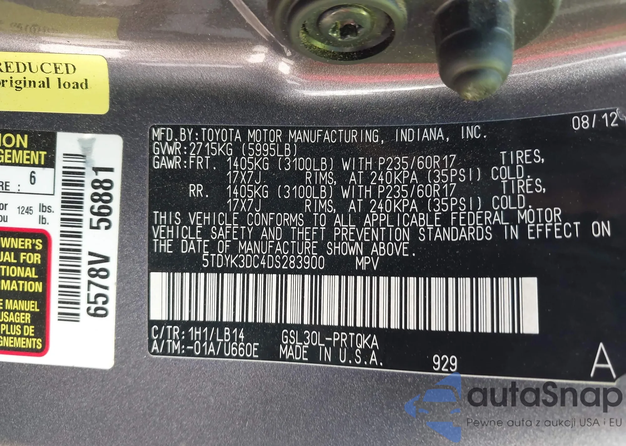 Автомобиль Toyota Sienna 2013 (VIN 5TDYK3DC4DS283900) имеет документы, препятствующие регистрации. Могут возникнуть сложности при экспорте и регистрации. Обратитесь к экспертам AutaSnap для поиска альтернатив.