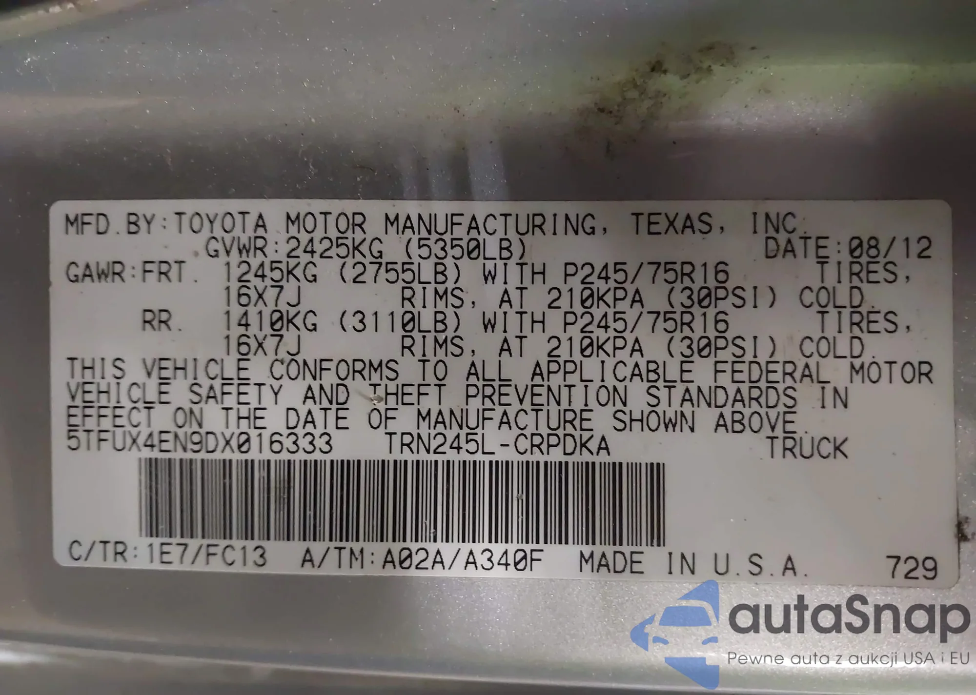 • VIN: 5TFUX4EN9DX016333