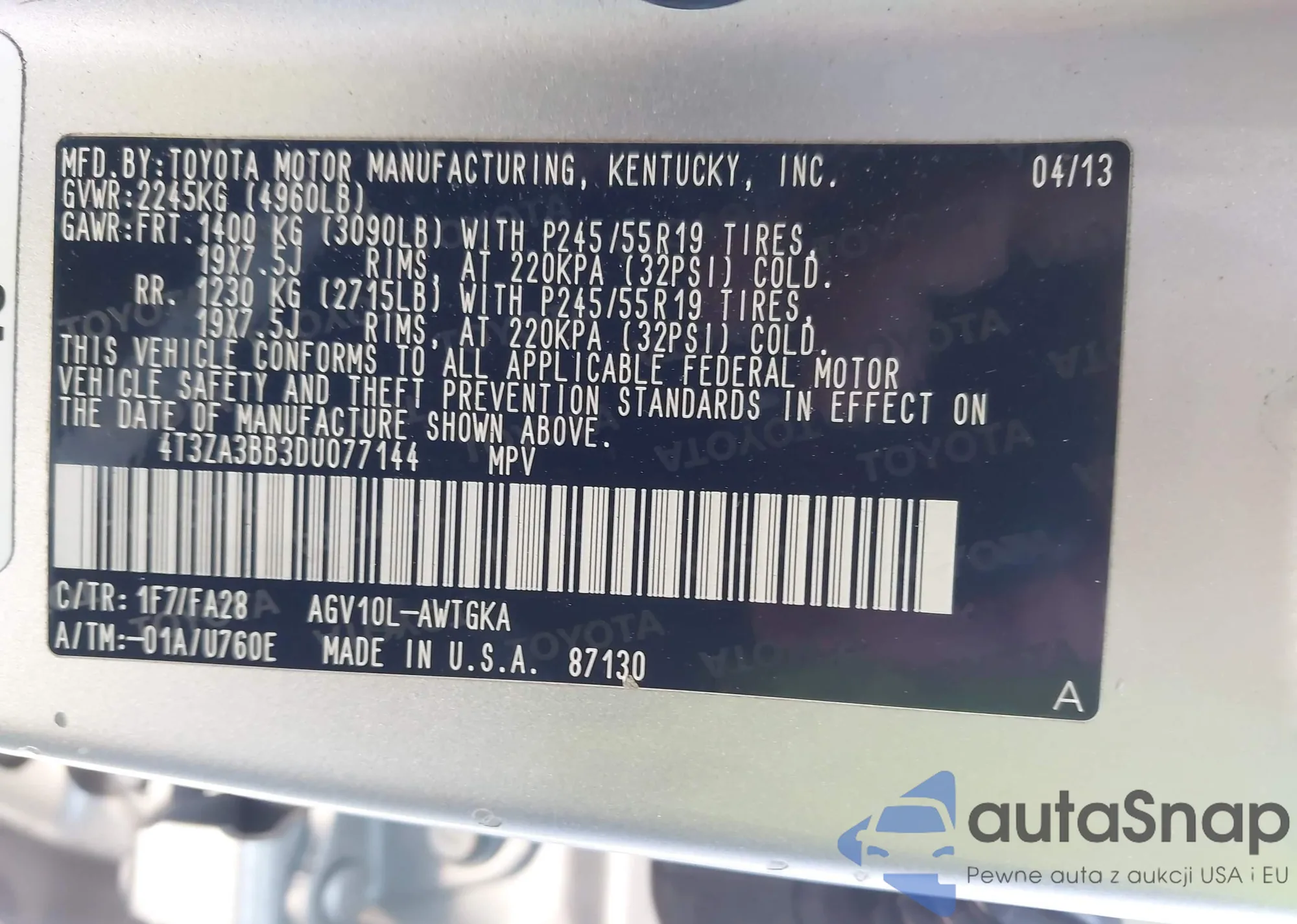 VIN: 4T3ZA3BB3DU077144