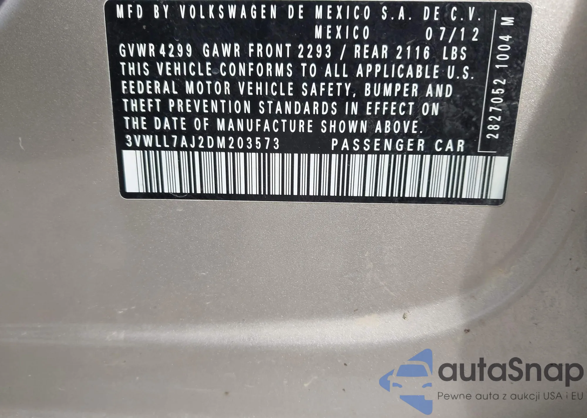 Автомобиль Volkswagen Jetta 2013 (VIN 3VWLL7AJ2DM203573) ранее не участвовал в торгах. Документы чистые, пробег соответствует или ниже среднего по рынку. Продаётся страховой компанией — рекомендуем покупку. Доставка в порт займет около 6–8 недель.