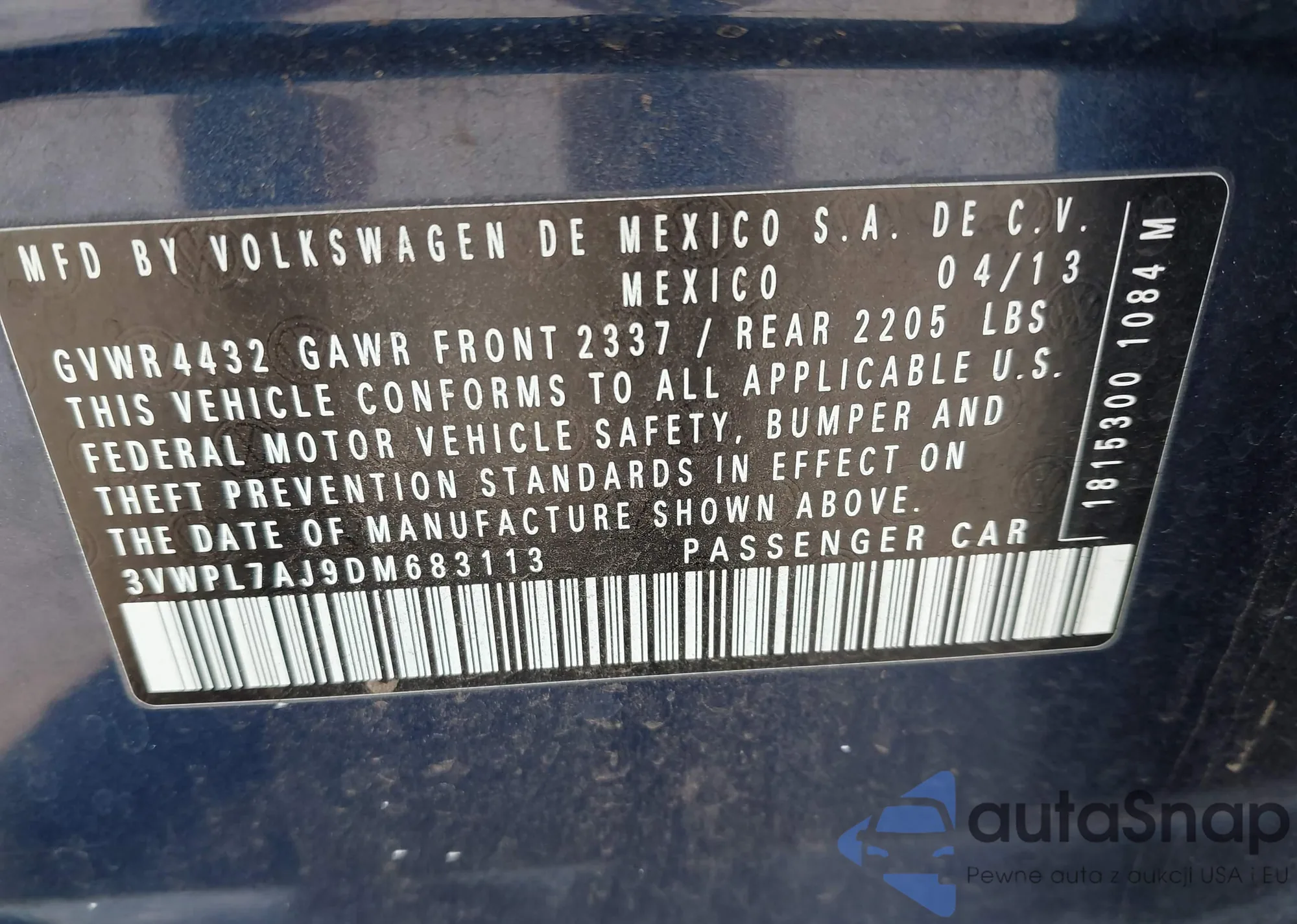 VIN: 3VWPL7AJ9DM683113