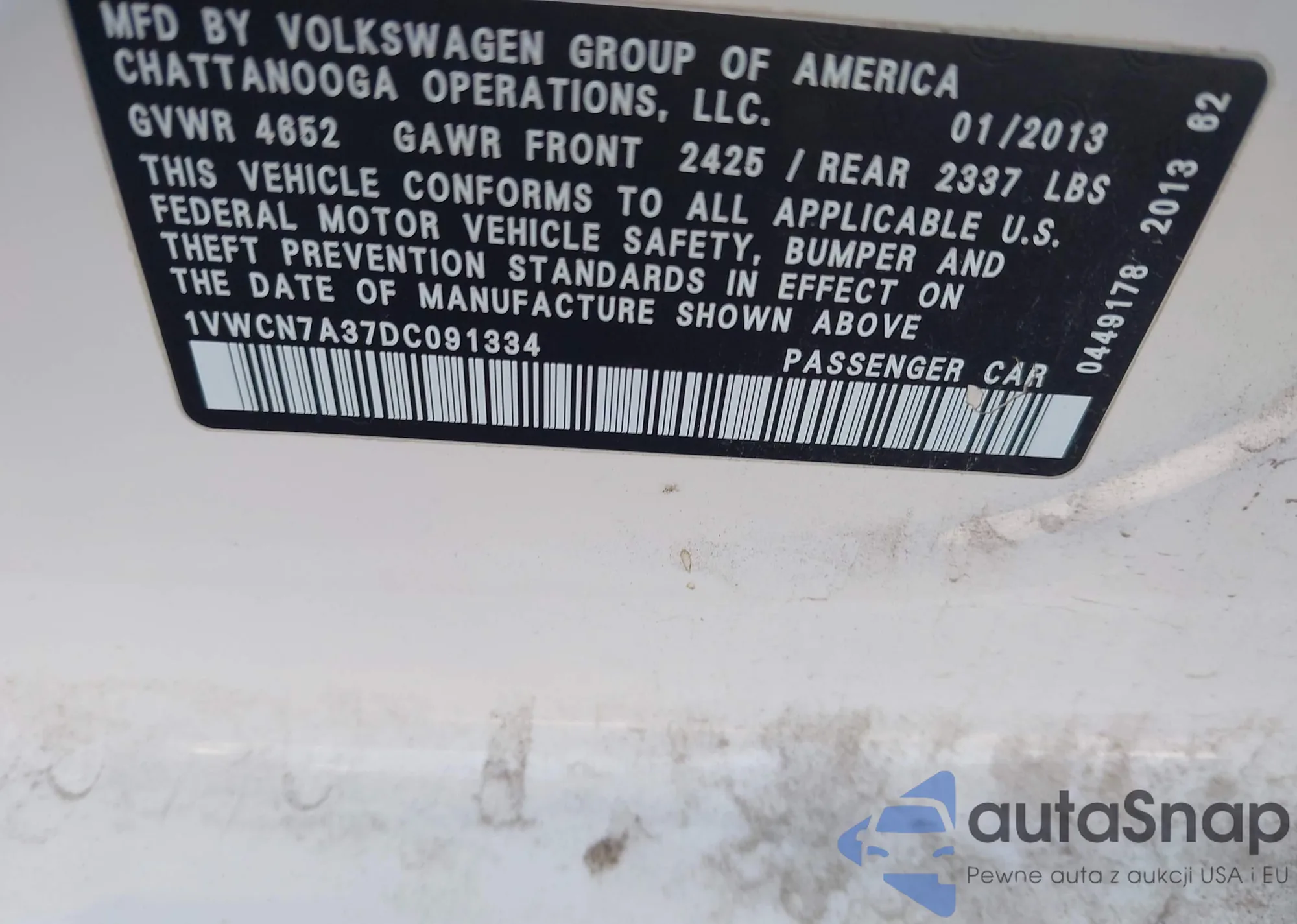 Автомобиль Volkswagen Passat 2013 (VIN 1VWCN7A37DC091334) ранее не участвовал в торгах. Документы чистые, пробег соответствует или ниже среднего по рынку. Продаётся страховой компанией — рекомендуем покупку. Доставка в порт займет около 6–8 недель.