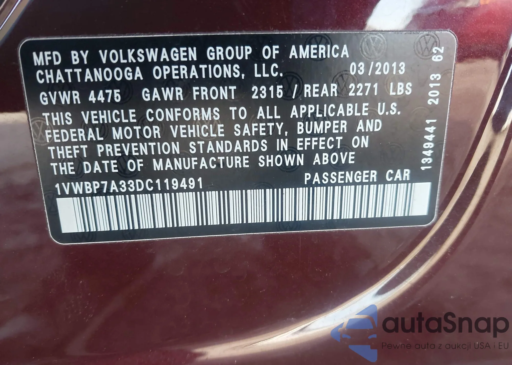 VIN: 1VWBP7A33DC119491
