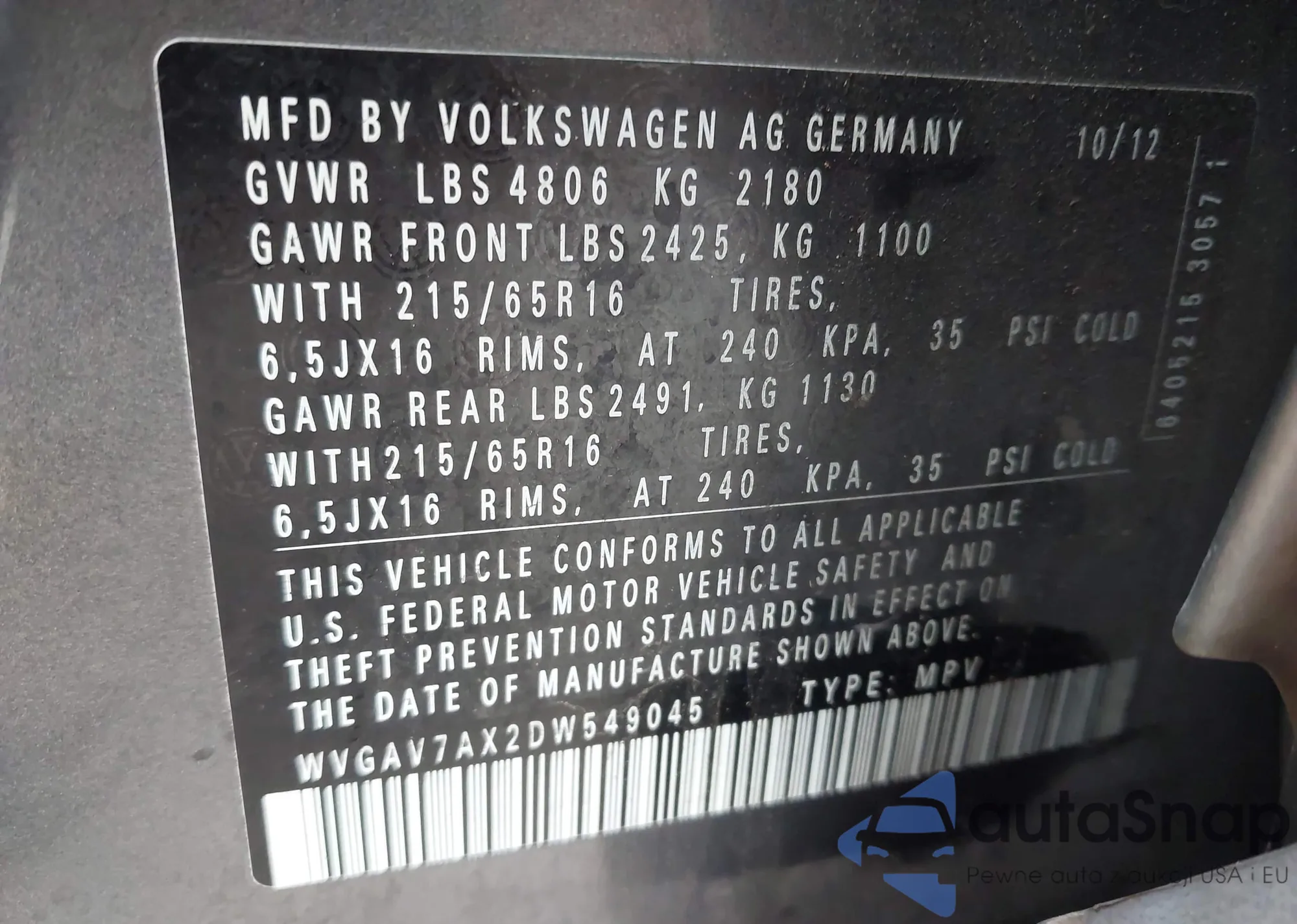 • VIN: WVGAV7AX2DW549045