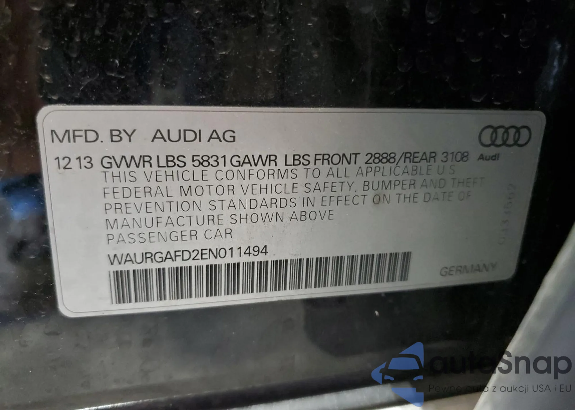 Автомобиль Audi A8 2014 (VIN WAURGAFD2EN011494) имеет документы, препятствующие регистрации. Могут возникнуть сложности при экспорте и регистрации. Обратитесь к экспертам AutaSnap для поиска альтернатив.