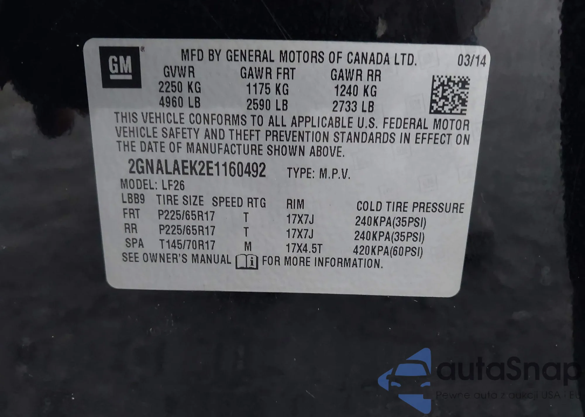 • VIN: 2GNALAEK2E1160492