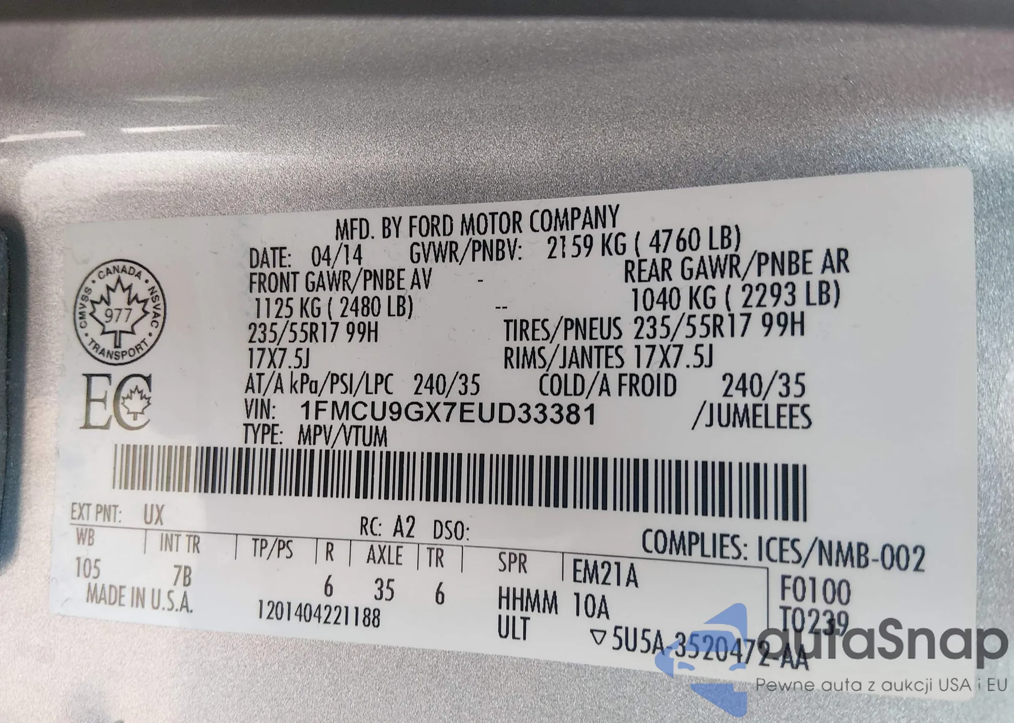 VIN: 1FMCU9GX7EUD33381