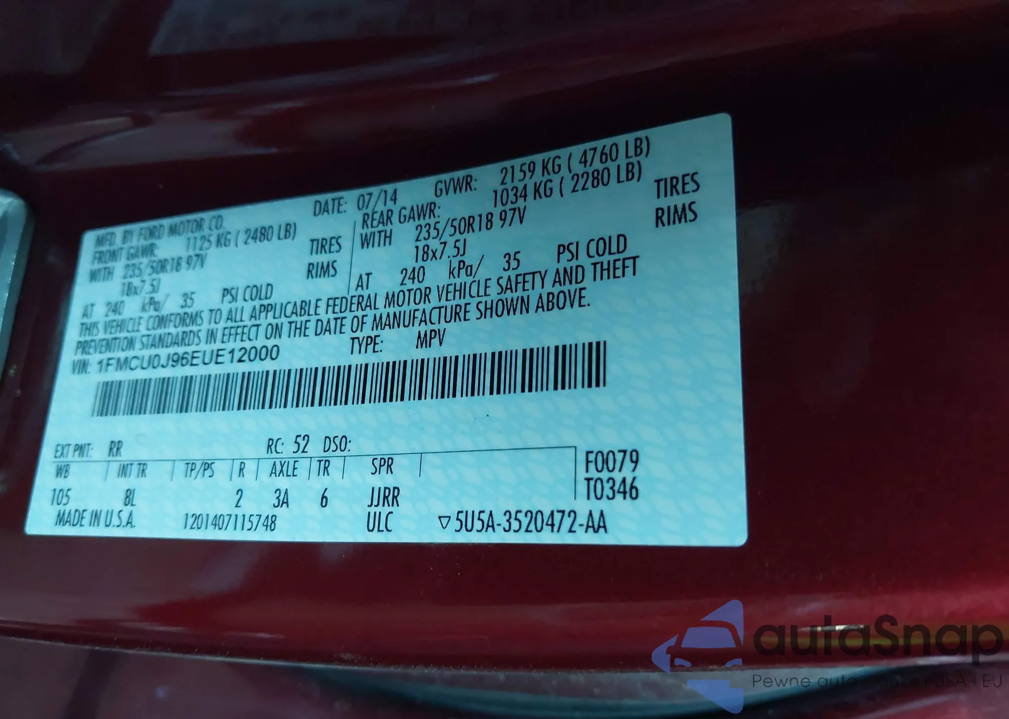 VIN: 1FMCU0J96EUE12000