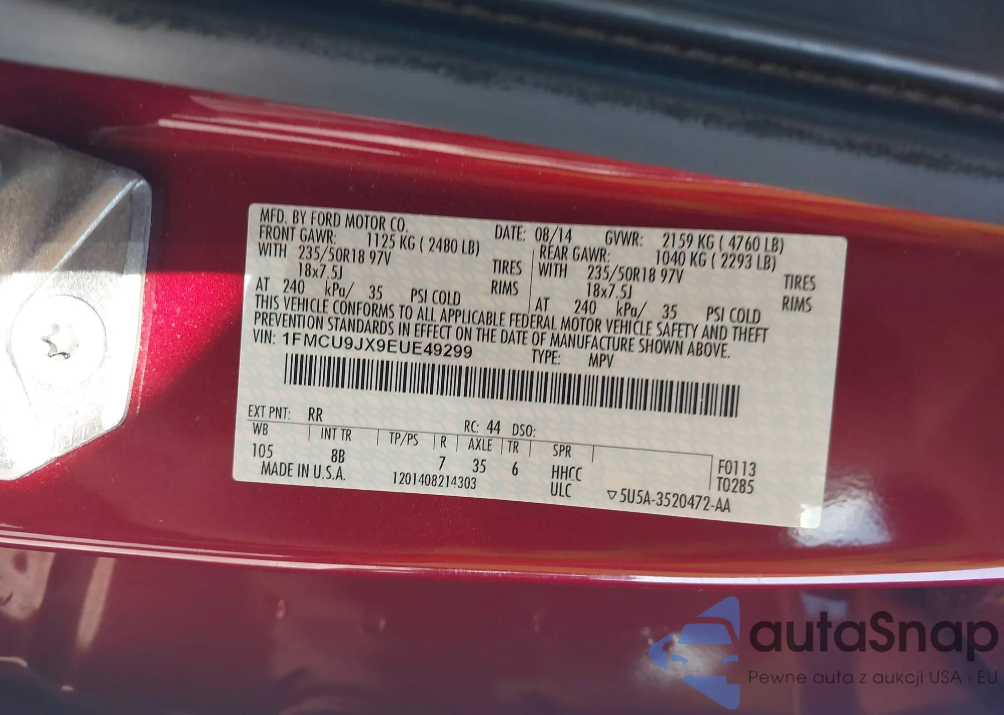 • VIN: 1FMCU9JX9EUE49299
