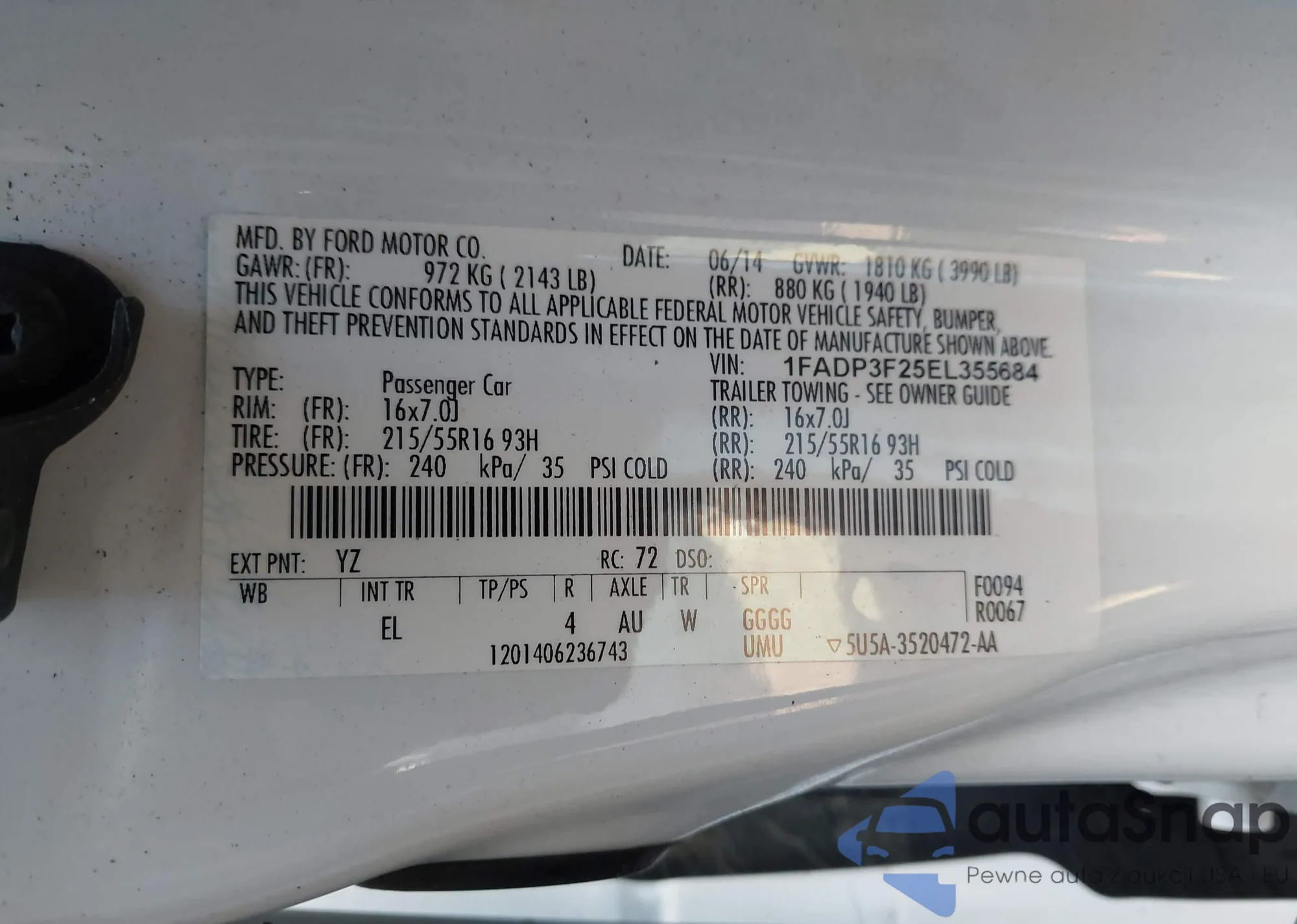 VIN: 1FADP3F25EL355684
