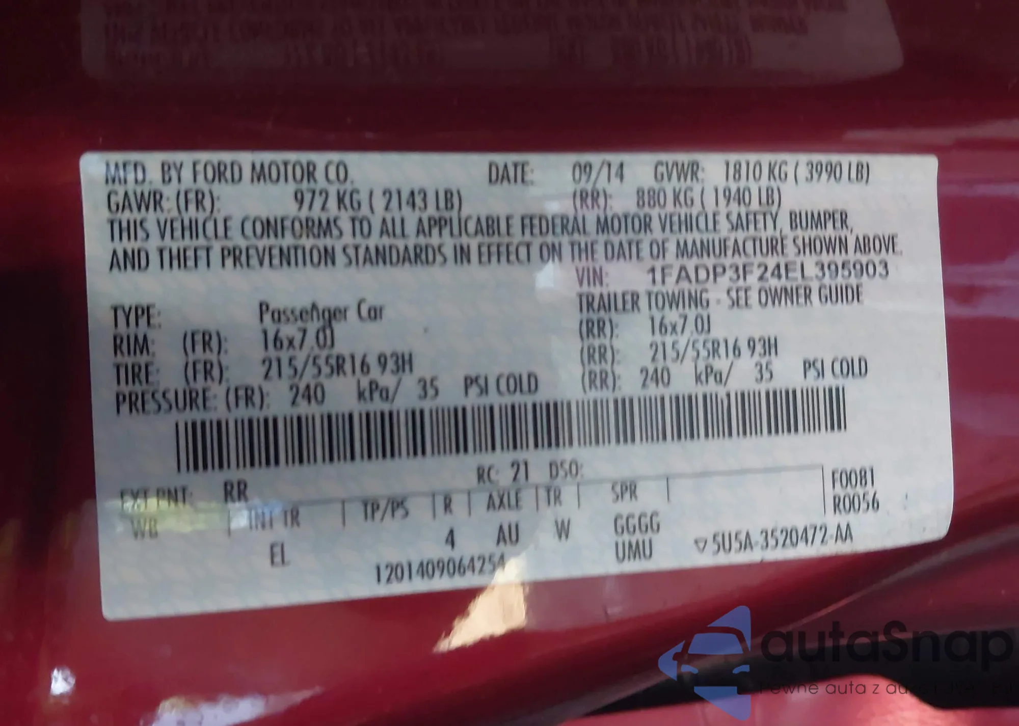 VIN: 1FADP3F24EL395903