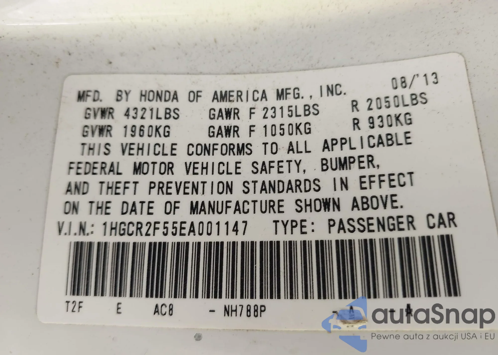 Автомобиль Honda Accord 2014 (VIN 1HGCR2F55EA001147) ранее не участвовал в торгах. Документы чистые, пробег соответствует или ниже среднего по рынку. Продаётся страховой компанией — рекомендуем покупку. Доставка в порт займет около 6–8 недель.