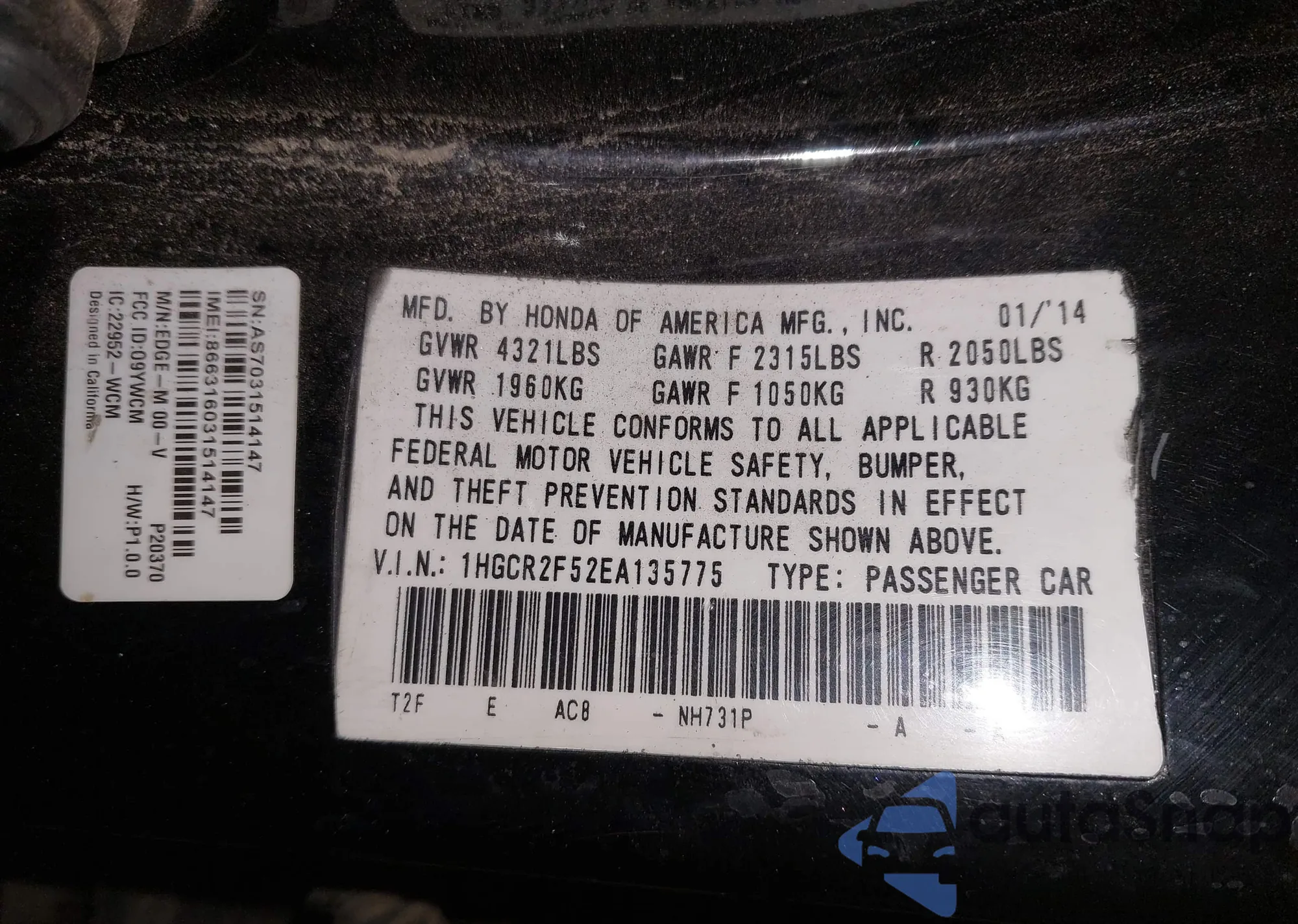 • VIN: 1HGCR2F52EA135775