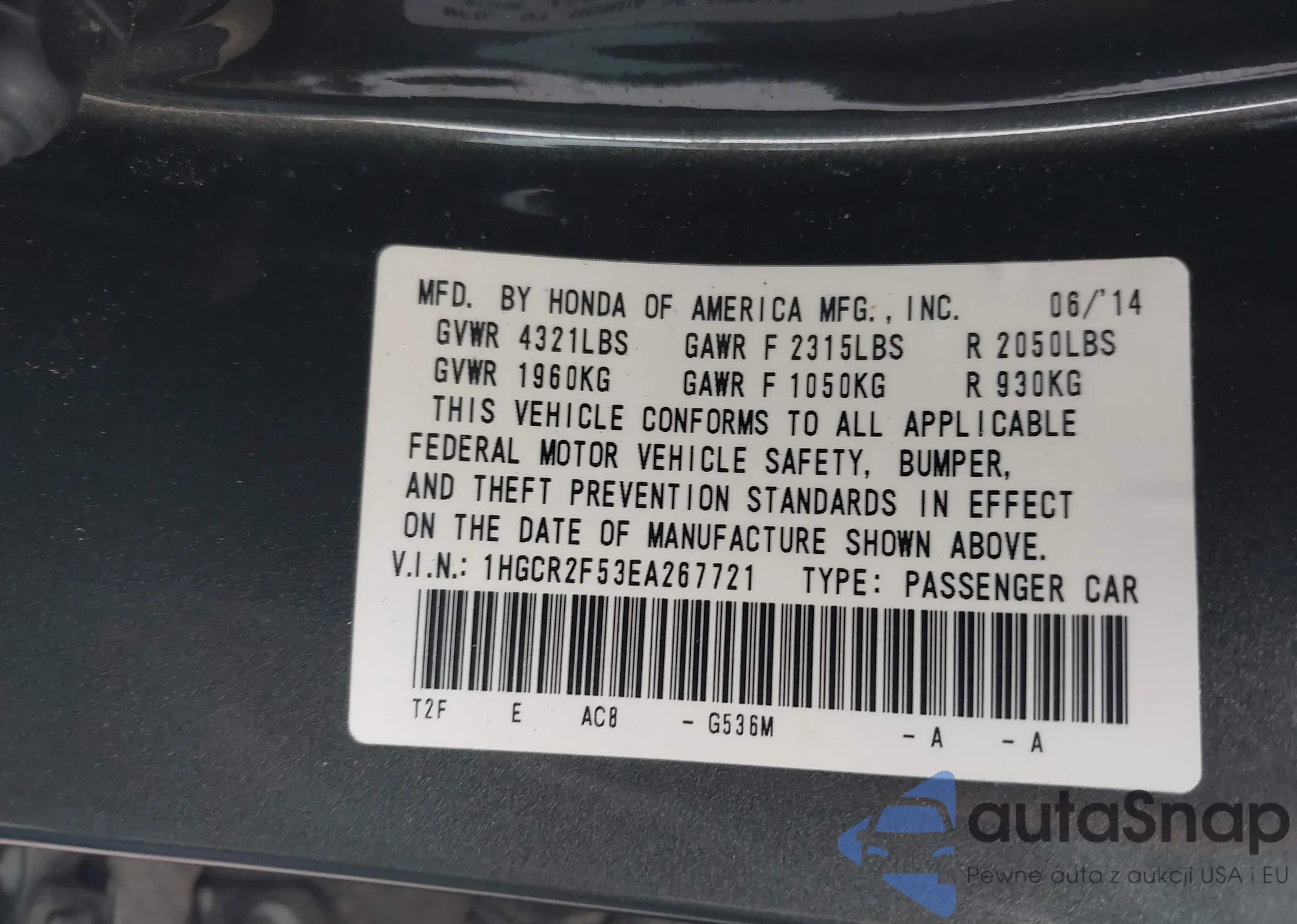 VIN: 1HGCR2F53EA267721