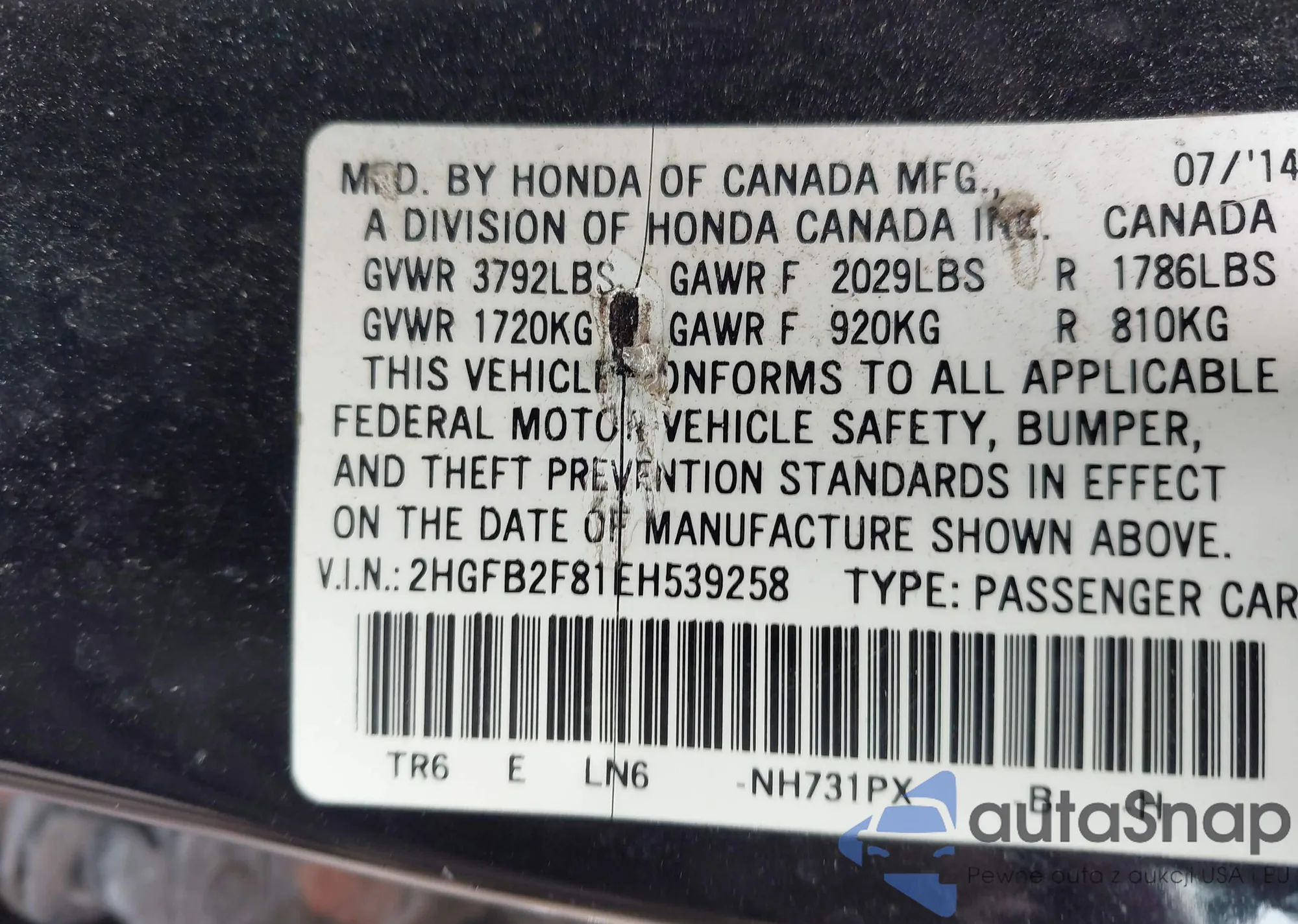 VIN: 2HGFB2F81EH539258